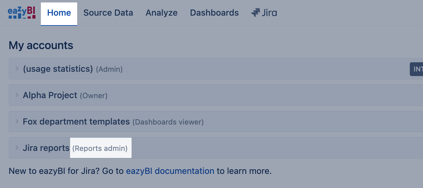 Jira users who have Jira Administrators global permission, Jira trusted users and eazyBI admin can create new eazyBI accounts. The user who creates the eazyBI account is the Owner of the account. The owner has all rights to this account and also can add additional users. You can access the Account users page either from the Home tab or from the top right navigation bar:
