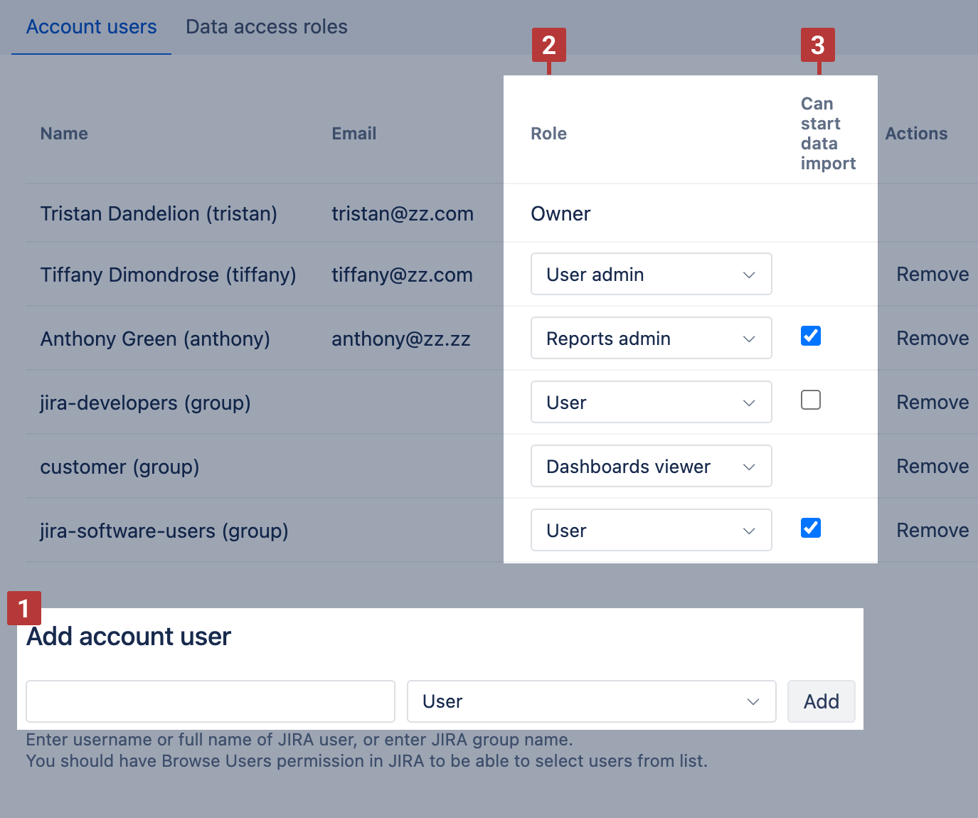 For each user, assign a role to grant the necessary access to eazyBI functionality [2]. Additionally, on eazyBI for Jira Cloud and Data Center, you can allow users with Report admin or User roles to start data import [3]. This option allows them to access the Source Data section and click on Import to initiate incremental data import, but they won't be able to edit import optiosn or perform other activities available for users with higher roles. Add eazyBI advanced settings to enable the "Can start data import" option.