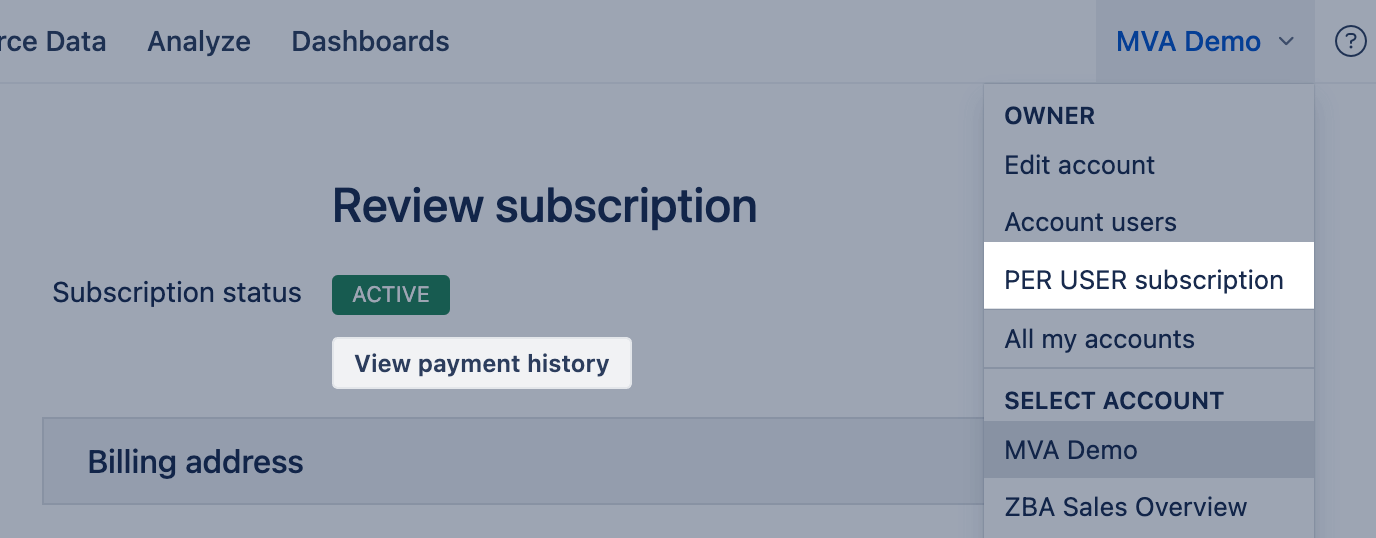 - Click on the account name in the top-right corner and select PER USER Subscription item from the dropdown.