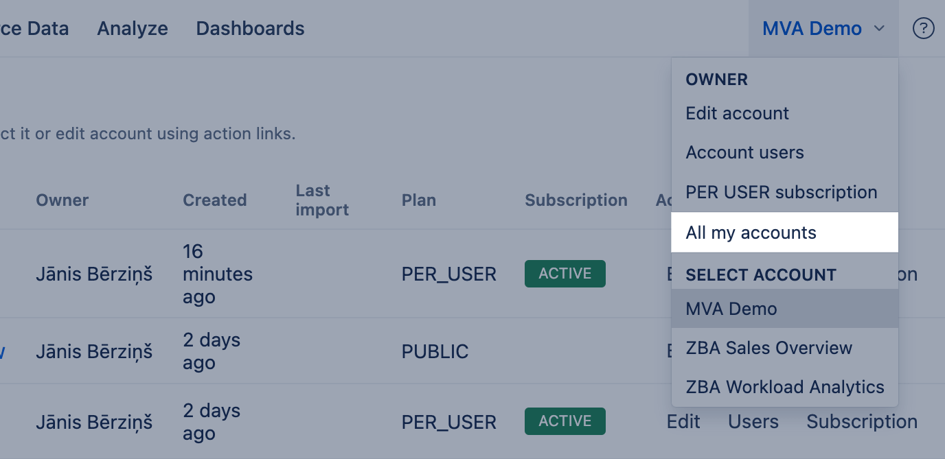 One eazyBI account contains a data set that can be analyzed by one or many account users. At any given time, you can work with one selected current account (you will see the existing account on the top-right header menu). You can choose the current account either from the Home tab or from the account selection drop-down in the top-right header menu.