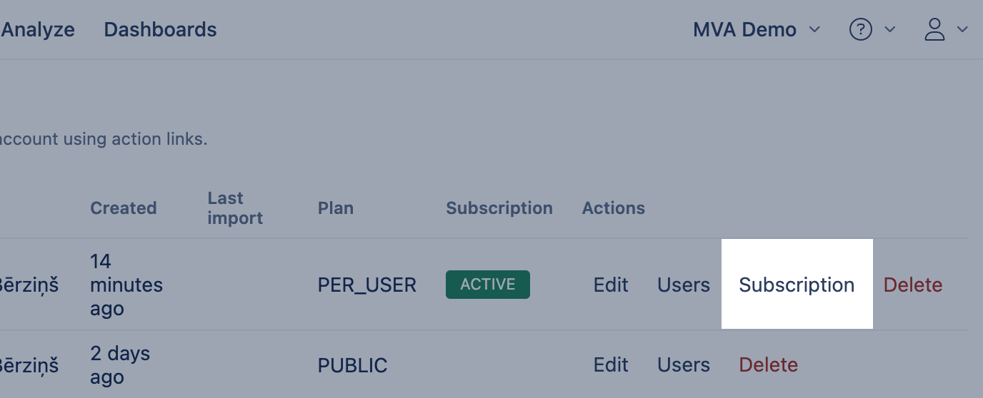 - After a moment, go back to the eazyBI accounts page and check if the account subscription is in Canceled status (if not, then refresh the page after some while).
