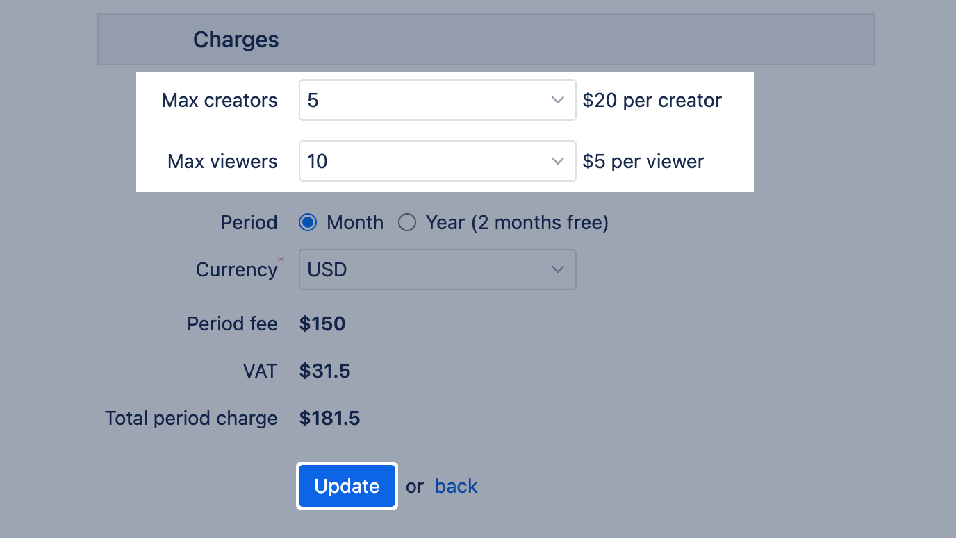 - Set the max creators or max viewers; eazyBI automatically calculates the new price.