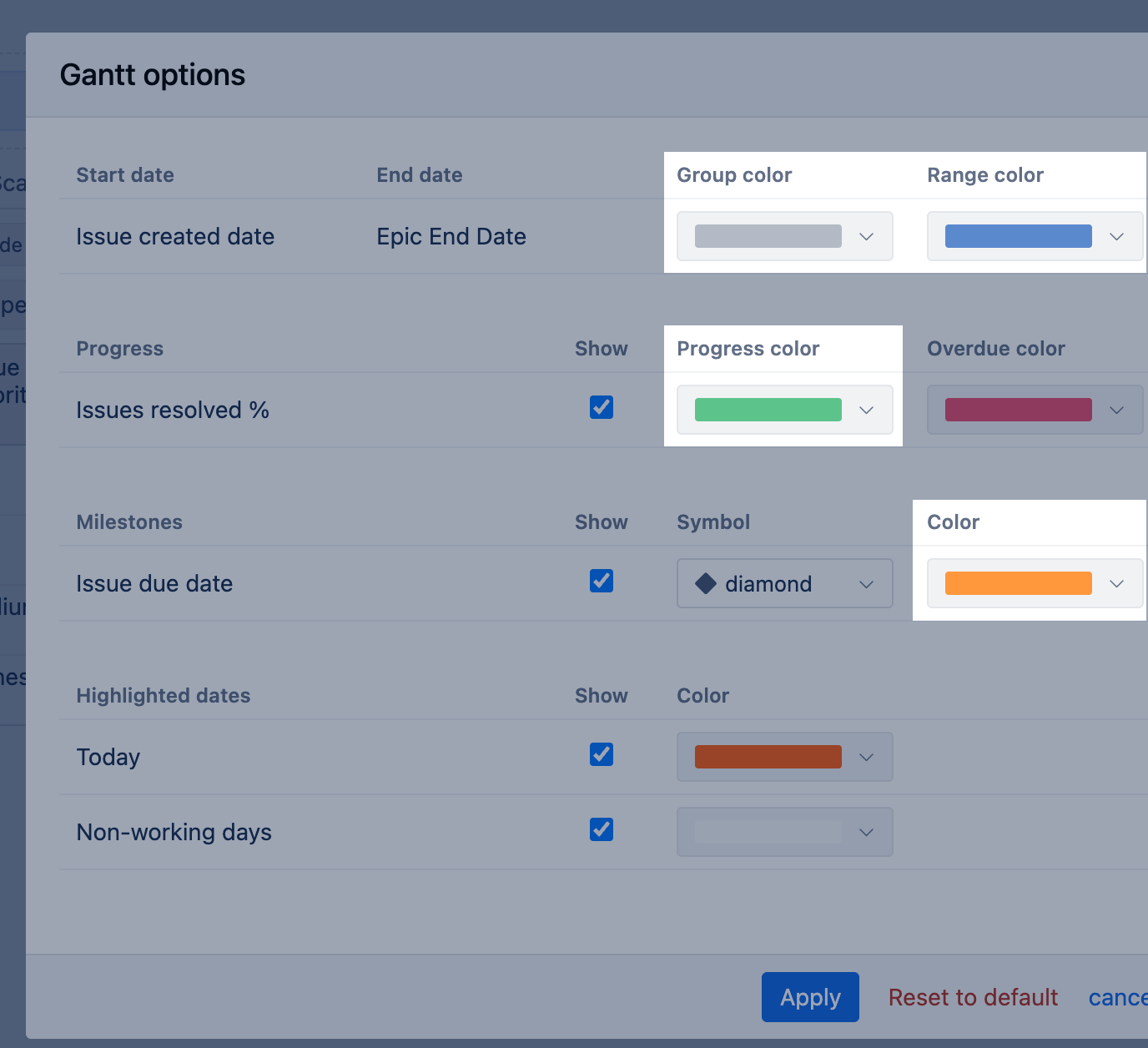 - Milestones use only the milestone color and are not affected by Group color, Range color, Progress color, or Overdue color.