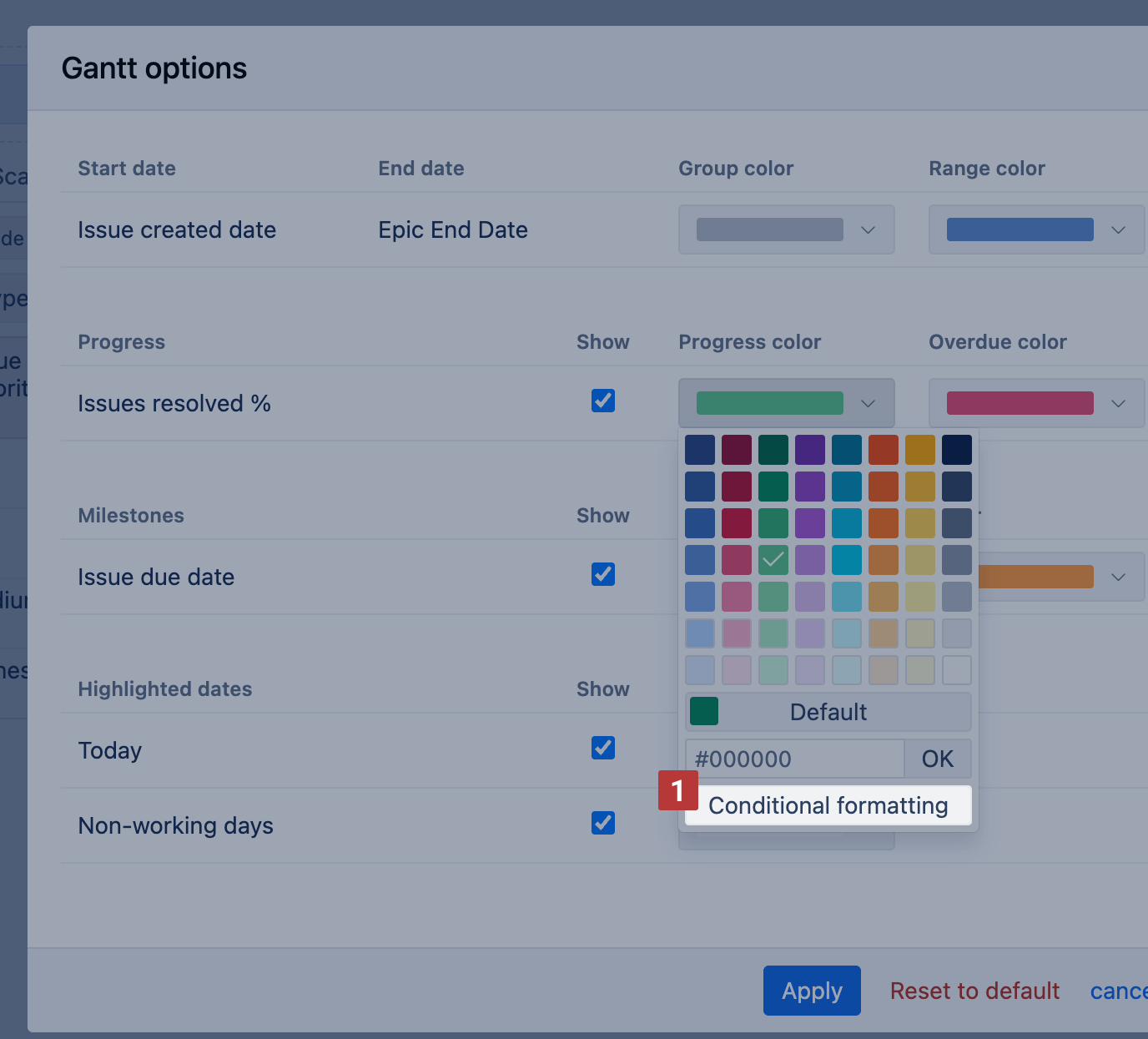 In Gantt charts, you can define conditional formatting conditions for: Group color, Range color, Progress color, and Milestones. Each of these elements can have its own conditional formatting.
