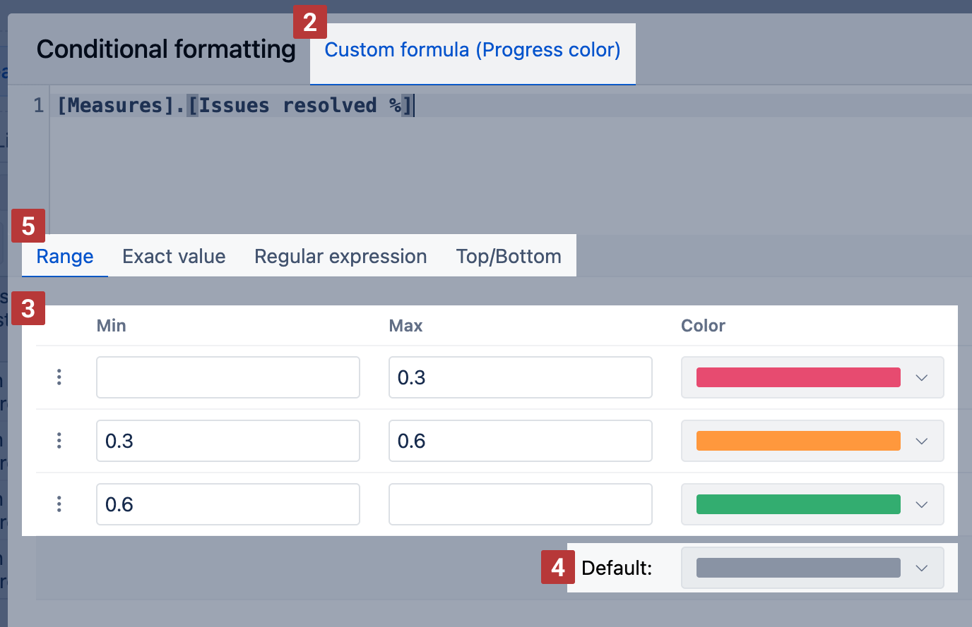 Specify one or several rules [3] to detect charts that should have different colors. You can set one or multiple rules, the first matching rule will be used. If no rule is applied, then the default color is used for the chart [4]. Define conditions using options [5]: Range, Exact value, Regular expression, and Top/Bottom. Select one of them.