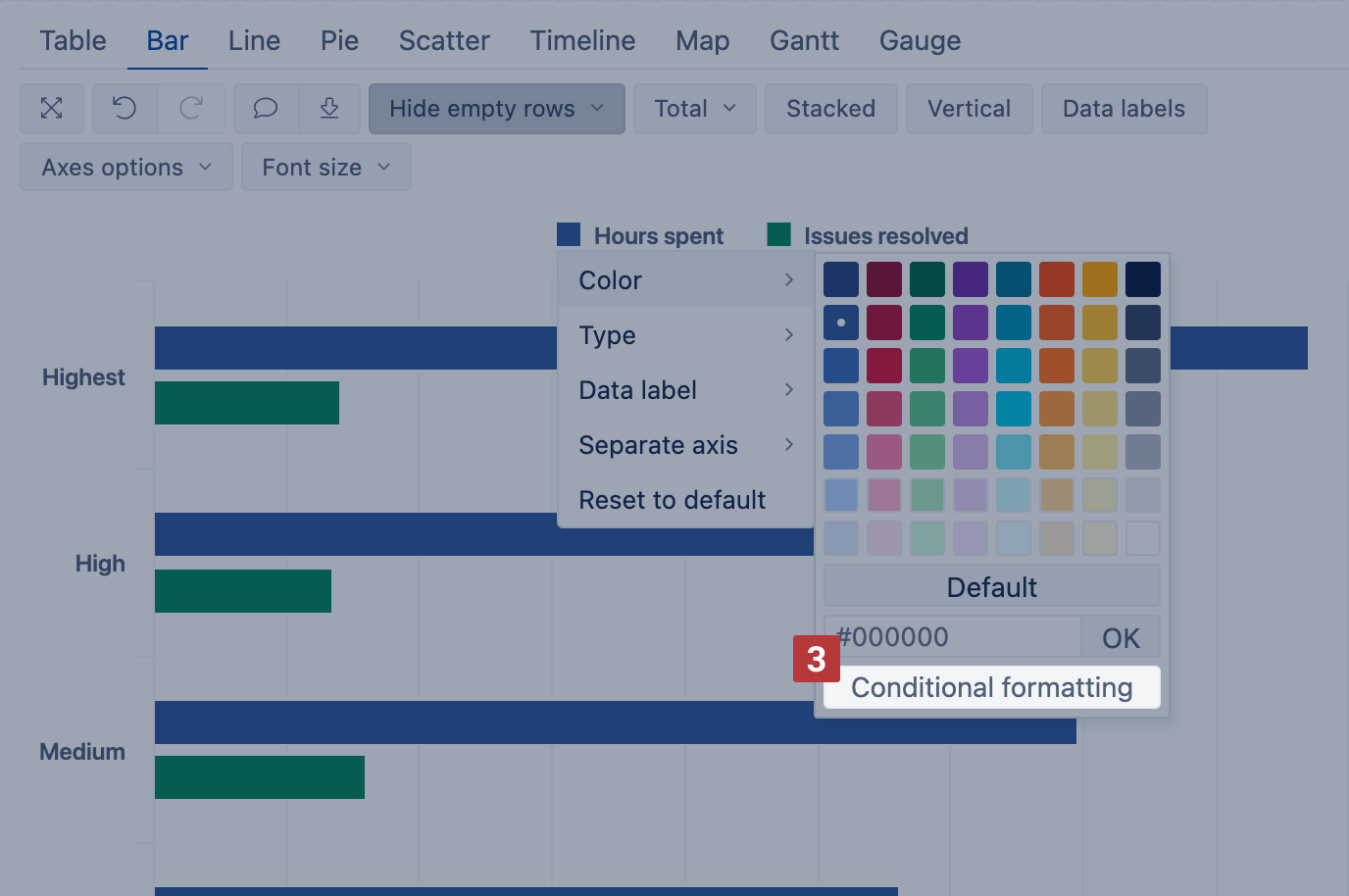 Using exact value condition together with custom formula, change bar color for priority Highest to red and High to orange.