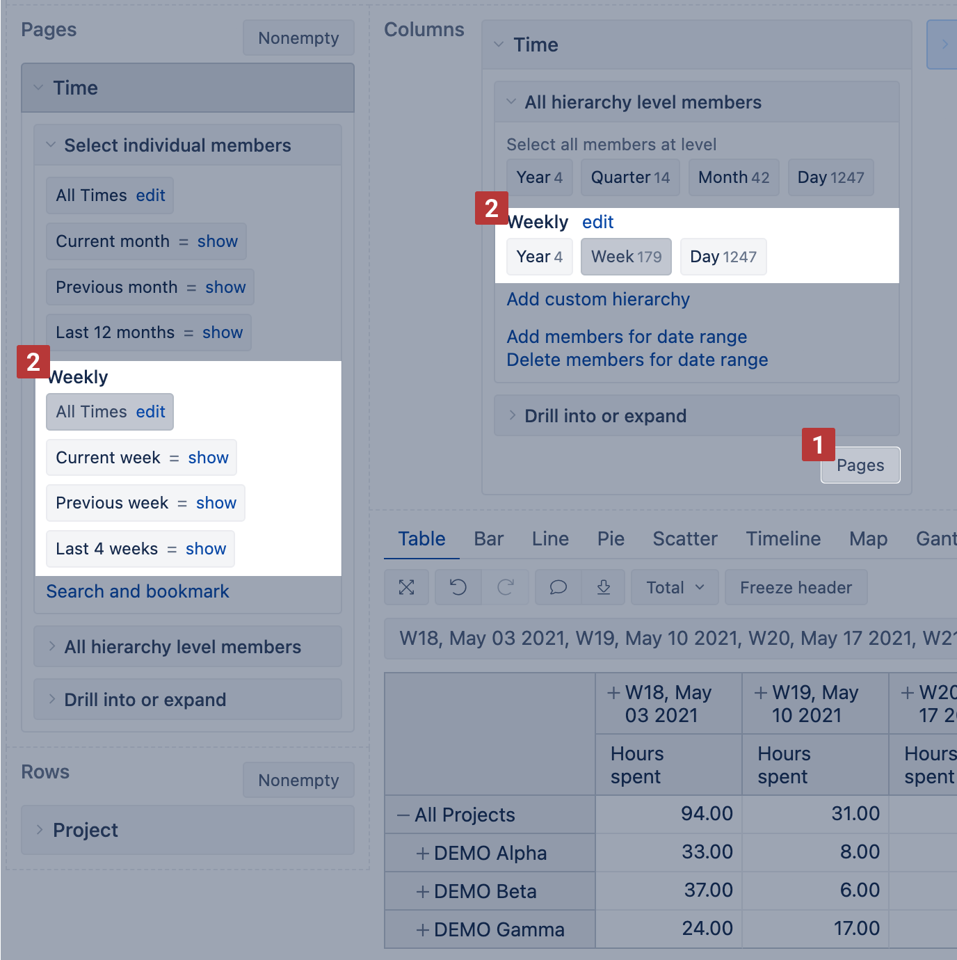 Make sure to use the same hierarchy on pages and columns [2]. For example, if you would like to see weeks on report columns, select also Weekly hierarchy members on pages.