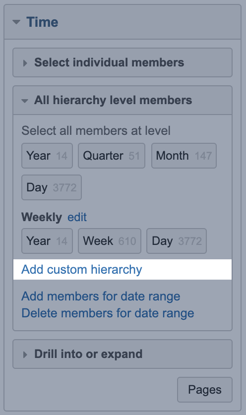 You can add additional custom hierarchies to the Time dimension with different rules with the Add custom hierarchy option. There are three types of custom hierarchies possible - fiscal monthly, multiple weeks, and calculated. This option is available for users with account Owner, User Admin, or Data Admin user roles.