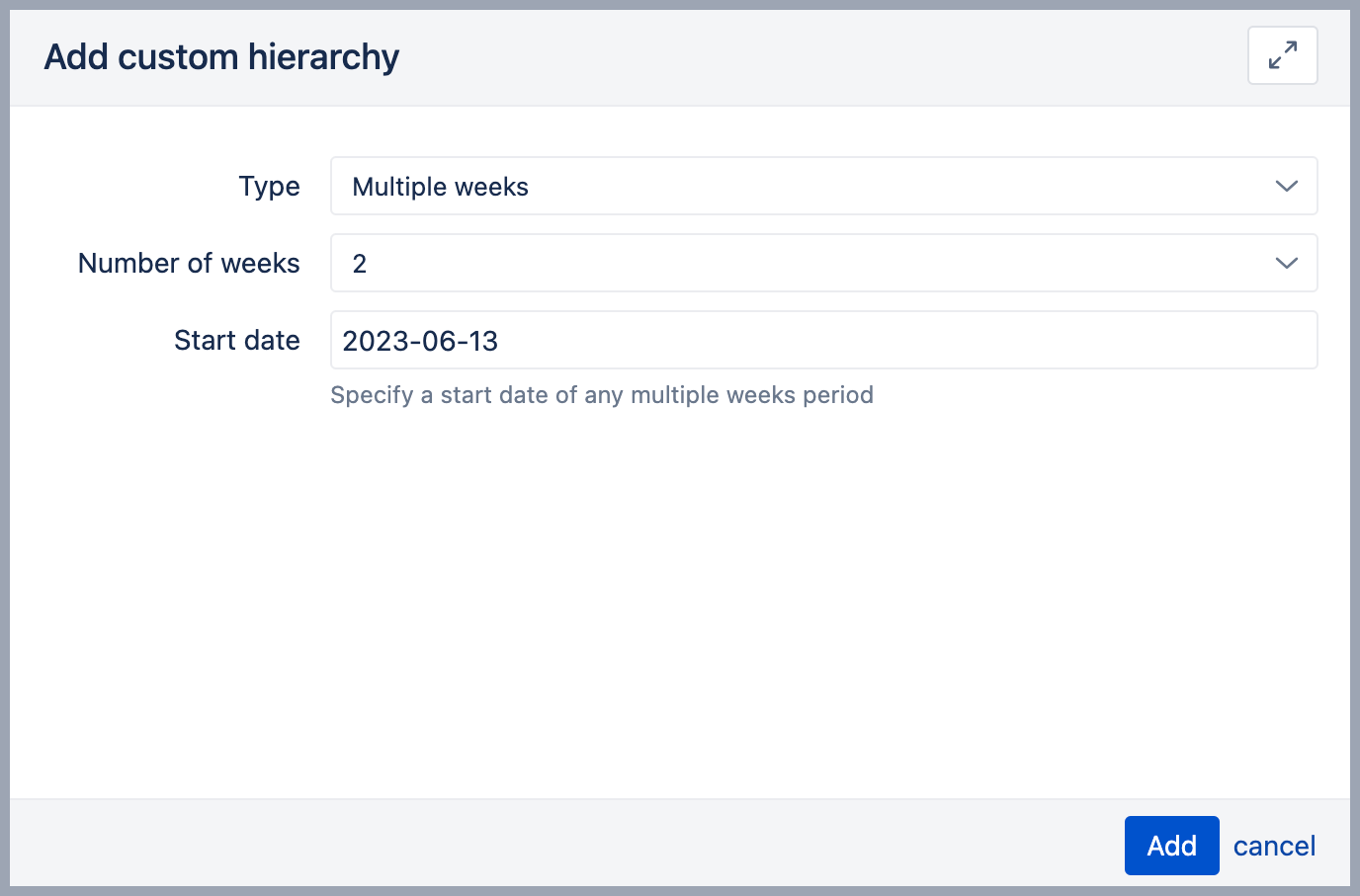 The other type of custom hierarchy allows the creation of new hierarchies of multiple weeks. You can choose one, two, three, or four-week periods and select a start date. The date determines from which date the multi-week period starts.