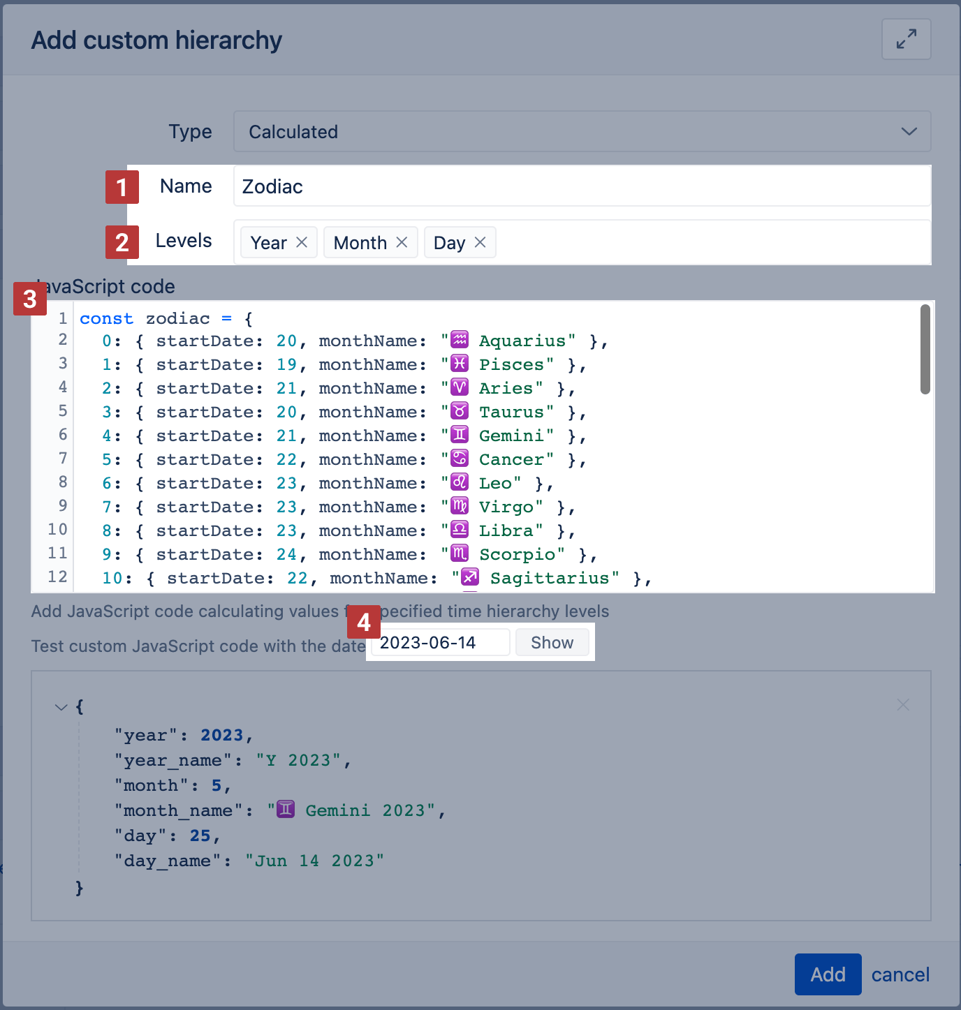 - The custom JavaScript code should calculate the numeric value of the display name value for each level of the date [3].