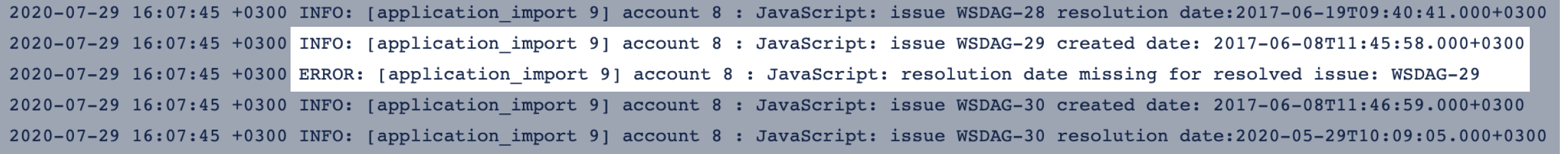 Please remove any function console.log() and console.error() used for testing from any JavaScript code when testing is done to avoid overloading of eazyBI queue logs with unnecessary data. We suggest leaving console log and error functions in JavaScript for specific error handling only.