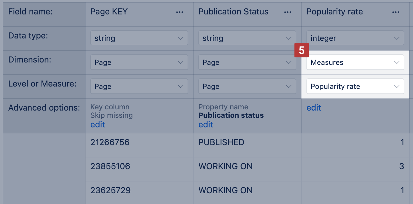 Next step is column mapping to Confluence dimensions and defining what will be the new measures.