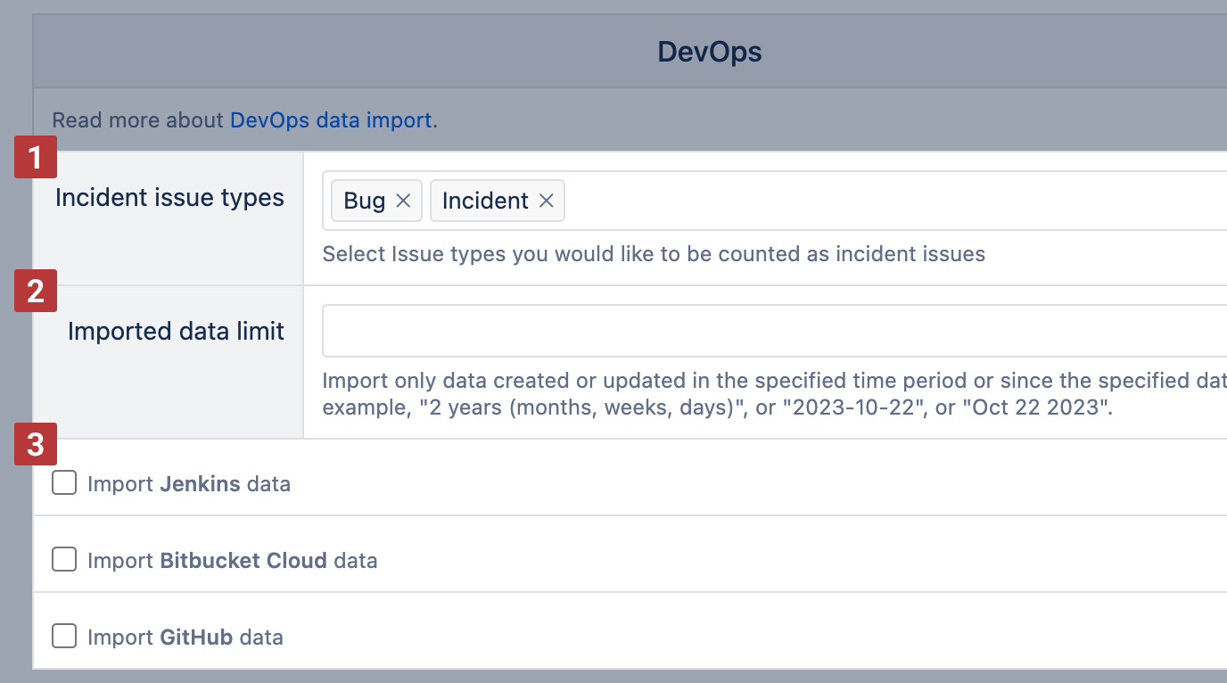 You can import only the most recent DevOps data to reduce import time and DevOps data imported into the cube. You can set an imported data limit [2] for DevOps data in two ways- relative time, like 3 months , or a specific date, like Oct 22 2023 , to set a date range from that date until now.
