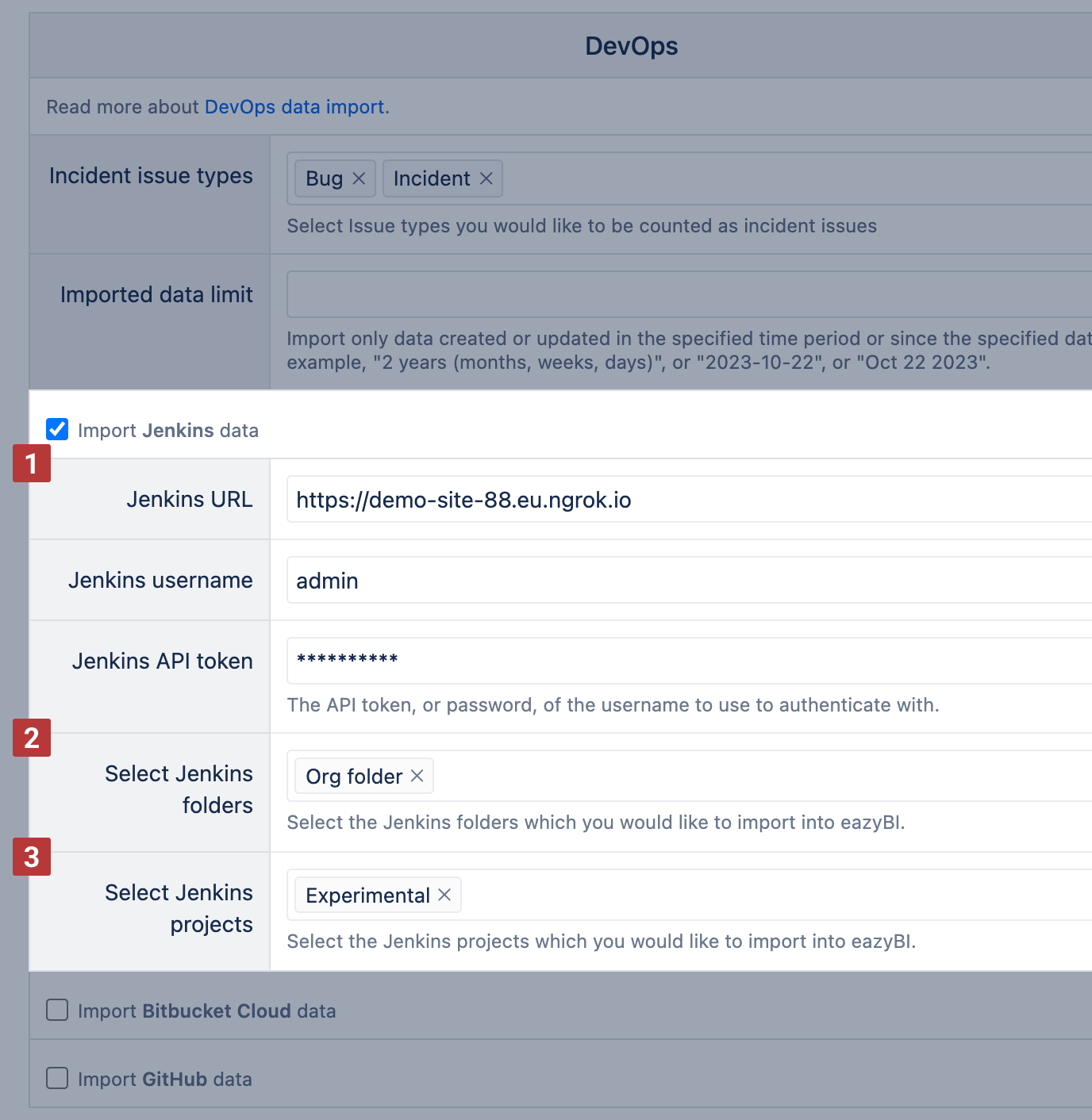 To import Jenkins data into eazyBI for Jira Cloud, add these parameters to your eazyBI advanced settings:
