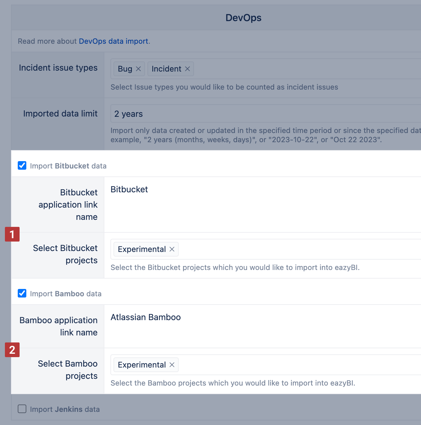 On Jira Data Center, data import from Bitbucket, Bamboo, Bitbucket Cloud, GitHub and Jenkins is available.