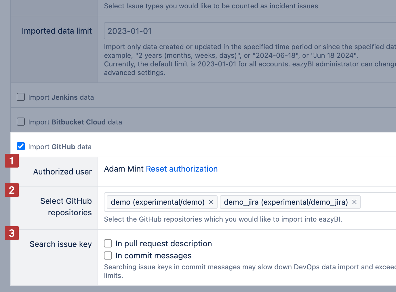 eazyBI will show the user [1] who authenticated the source and used this authentication for data import. You can reset authorization when needed. Specify the GitHub repositories [2] that eazyBI should read from and import data into the account.
