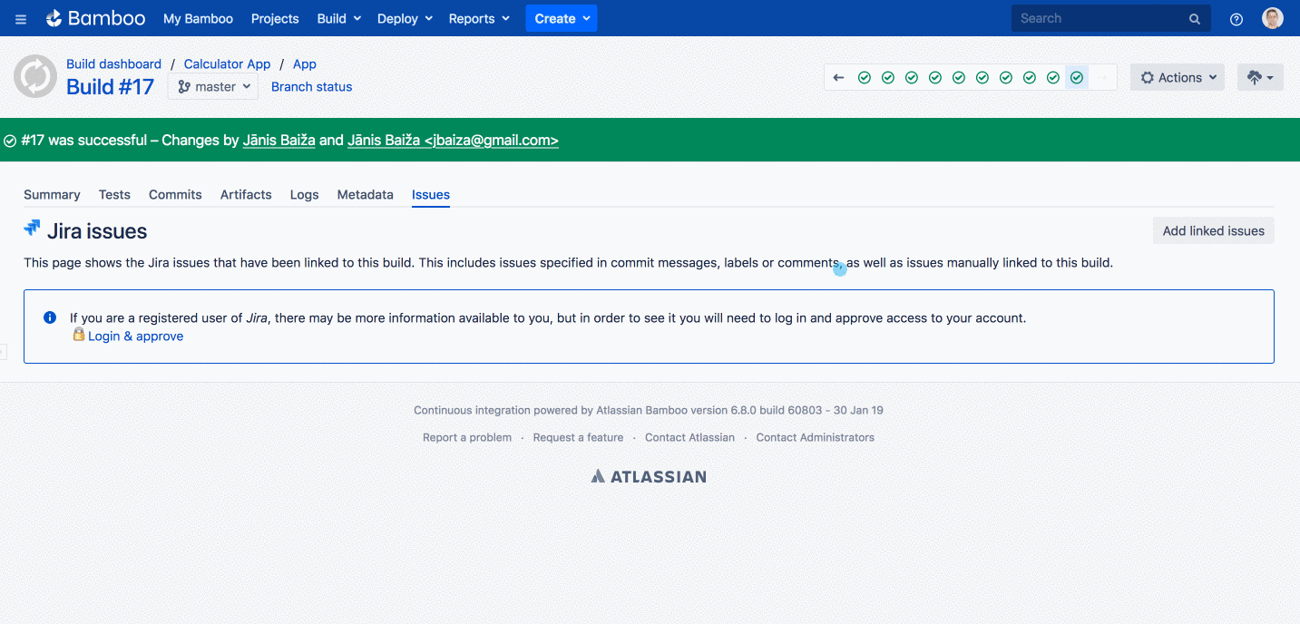 To also allow access from Bamboo to Jira, from the Bamboo build screen the user has to navigate to the Issue tab and click on Login & approve.
