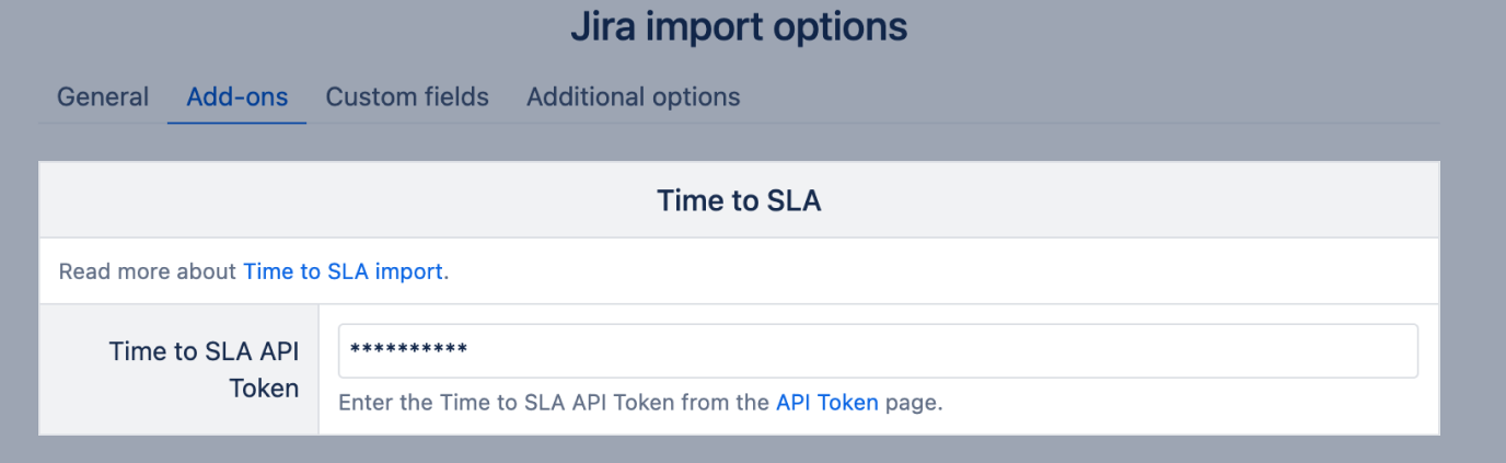 - In eazyBI, Jira import options Add-ons tab, you will see the Time to SLA section. Enter the generated API Token.