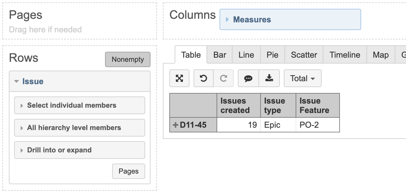 Incorrect issue link definition is one of the causes for failing issue hierarchy. How to troubleshoot the most common problems with issue link import, read in Import issue links troubleshooting article. - Create a test report to check whether higher level issue keys are imported correctly for each issue: use issues in rows and properties containing issue link custom fields used in the hierarchy in columns. In this case, Epic D11-45 has link to Feature PO-2.
