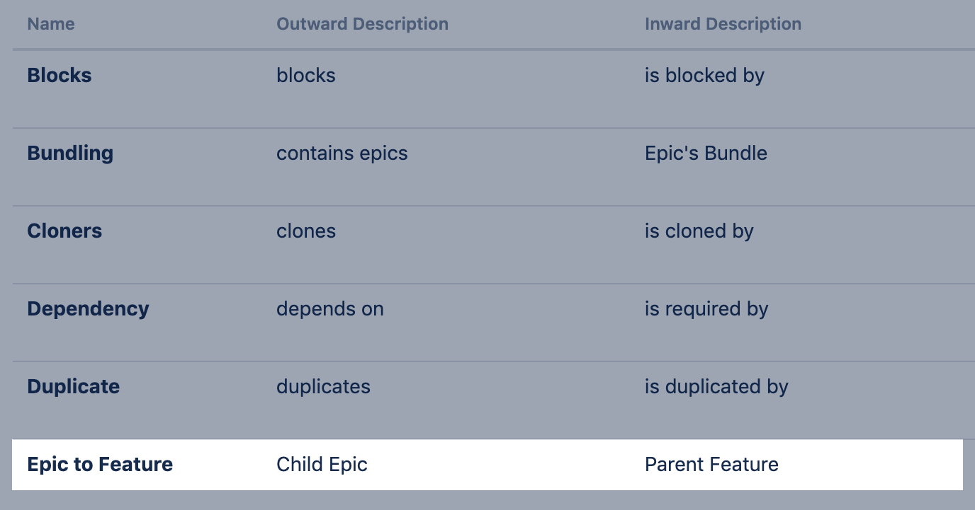 [jira.customfield_feature] name = "Feature" inward_link = "Parent Feature" issue_type = "Feature" update_from_issue_key = "epic_key"