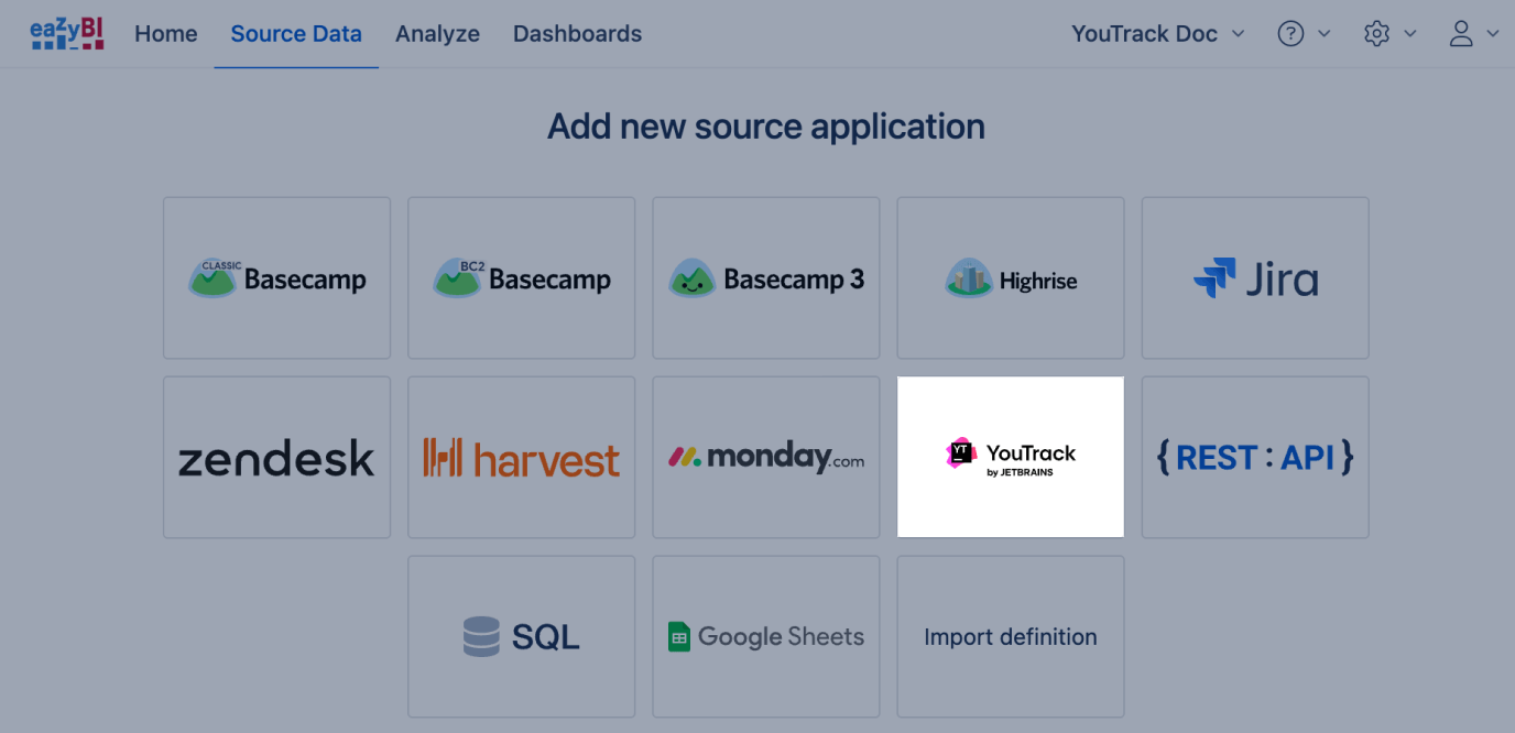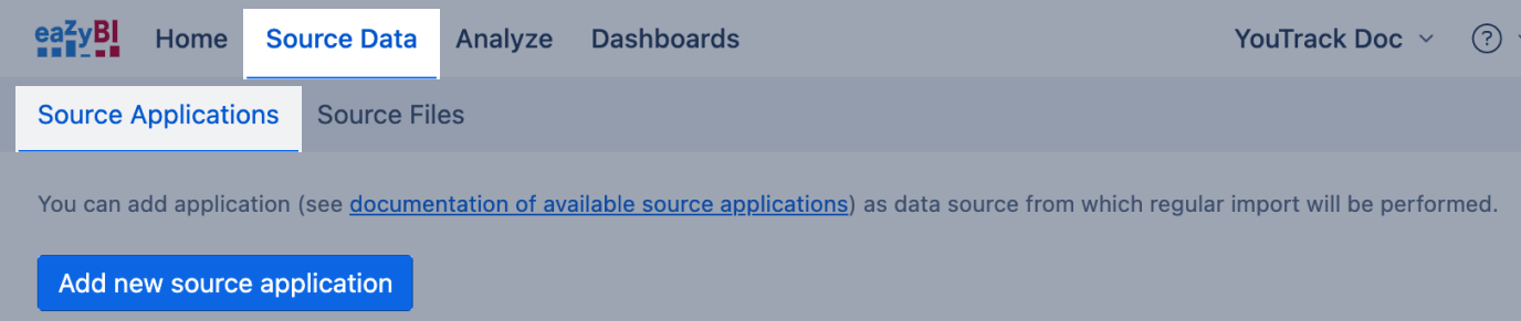After creating an eazyBI account, it's time to import the data from YouTrack. From the Source Data tab in Source Applications, select Add new source application, and select YouTrack.