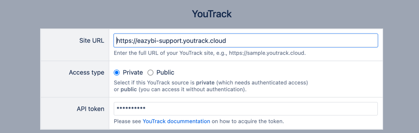 You will need to provide the site URL and Access type. If the Access Type is Private, provide an API token.