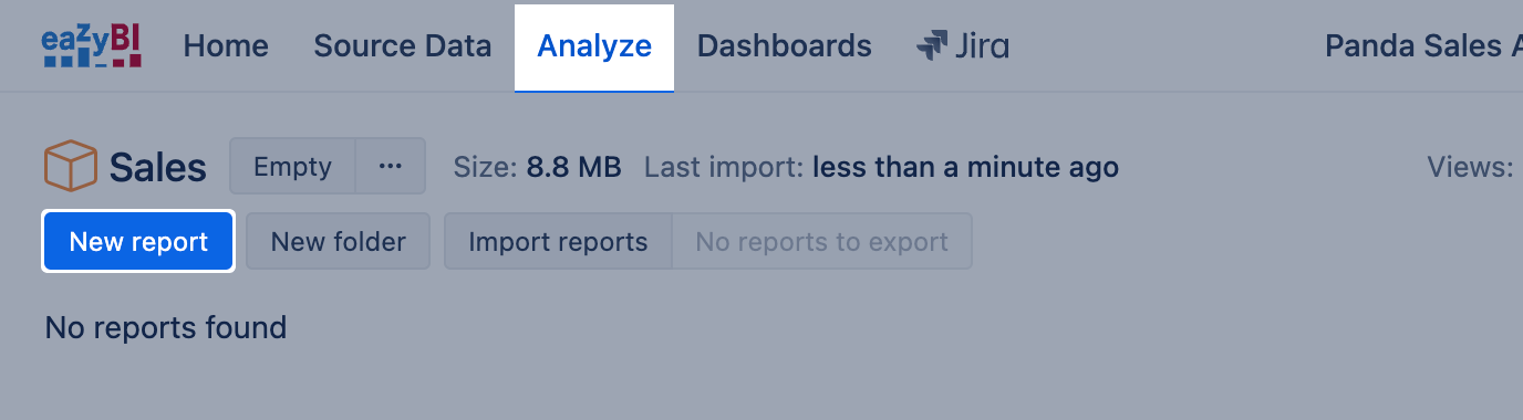 First of all, Create new account to create a data cube and start using eazyBI. You may have several accounts for different data sources and reporting purposes.