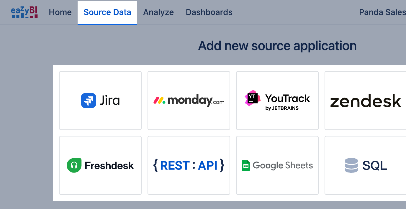Go to Source Data tab and select data import from SQL SELECT, REST API, Google Sheets, Excel file, or source system eazyBI has an integration.