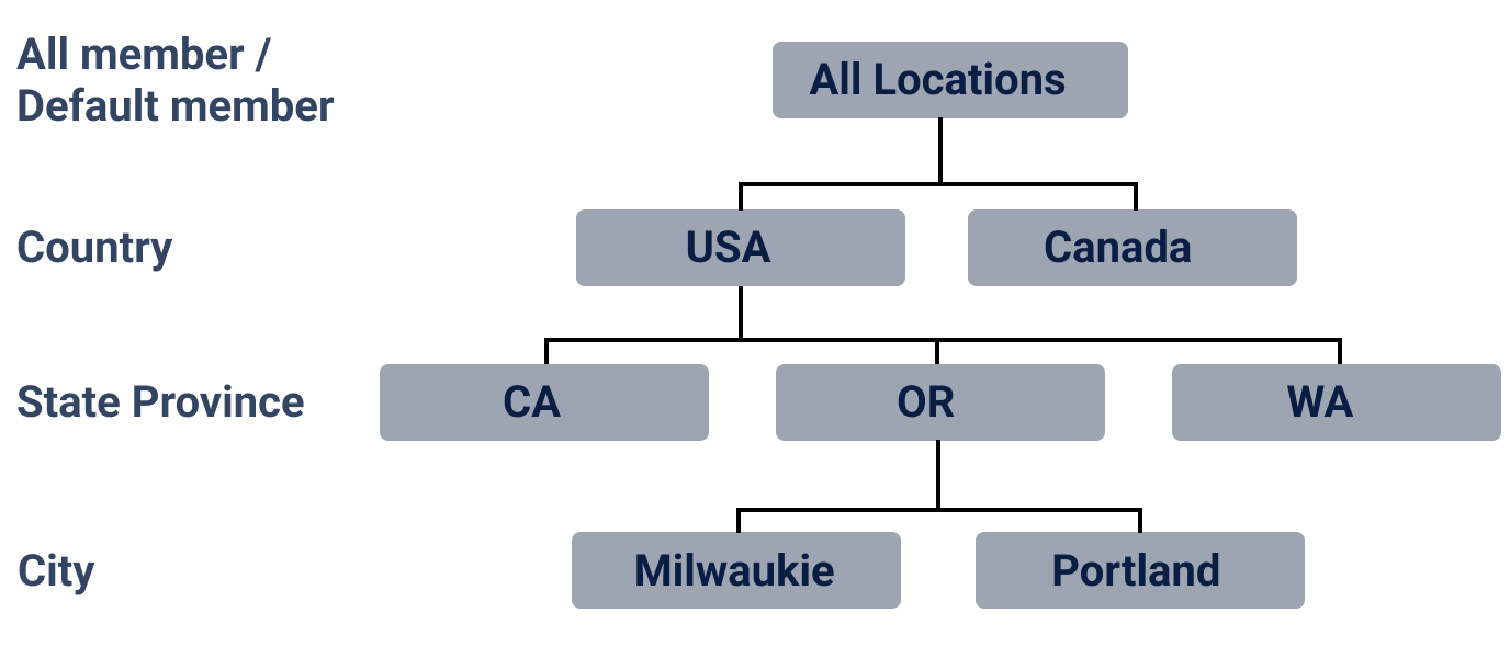 For example, in a Location dimension, each City is a member, and each State Province (a group of some cities) is a member, and All Countries (a group of all dimension members) is a member of the Location dimension.