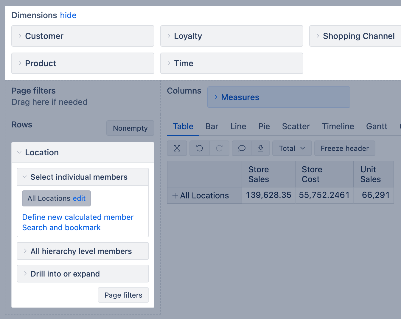 After importing data from source files or source applications, you can go to Analyze tab and start to explore data in the created cube. You can start creating table reports by dragging needed dimensions to columns, rows, and pages and exploring your data at different dimension levels. After selecting the needed data in the table report, you can switch to different chart reports to explore your data more visually.