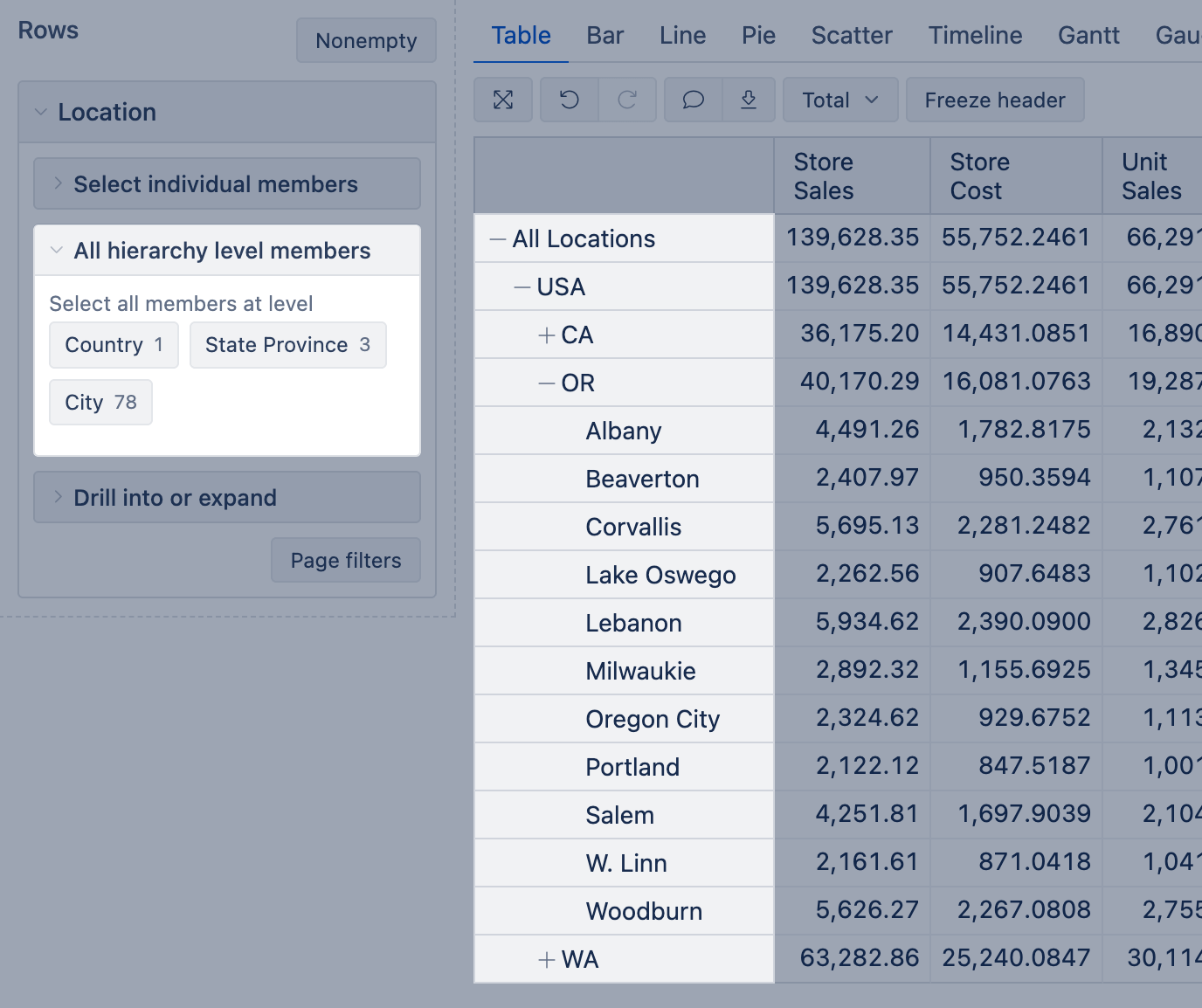 Each dimension in eazyBI has at least one hierarchy (the default hierarchy) with at least two levels: The top hierarchy level (the default or the root member) groups all imported members of that dimension, and the bottom hierarchy level (the leaf level) represents individual imported members.
