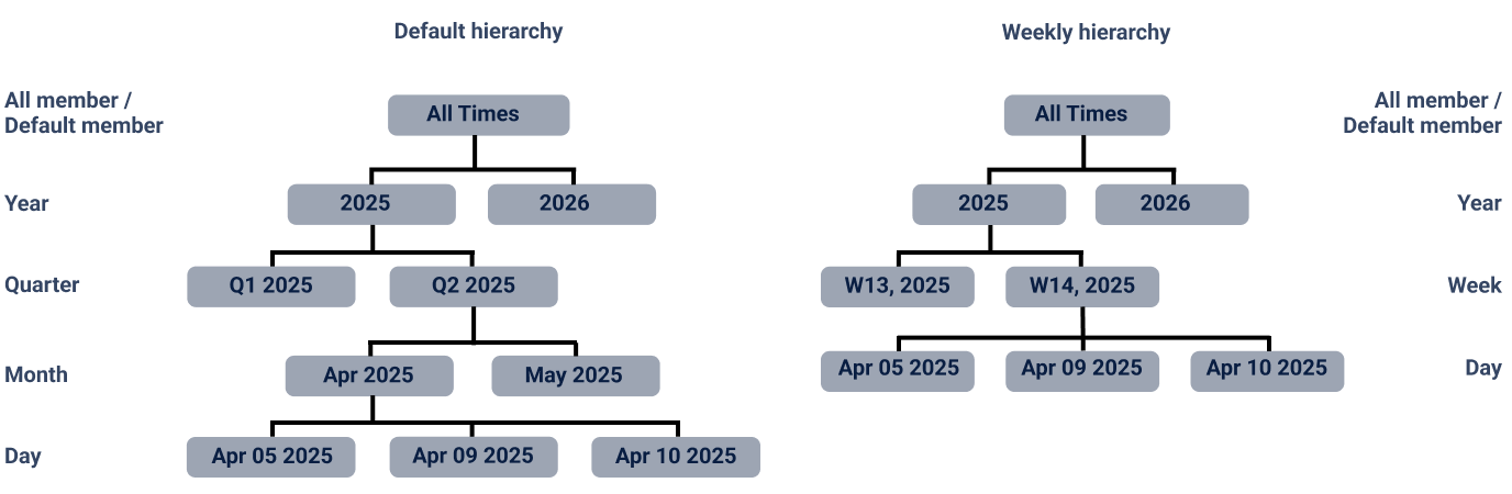 The most common example of a dimension with two or more hierarchies is the Time dimension. It has a default hierarchy with Year, Quarter, Month, and Day levels, which can be used to get totals of measures at selected time period levels. And the Weekly hierarchy with Year, Week, and Day levels. You can add more hierarchies to organize Day level members (the leaf level of Time dimension) by different groups, such as bi-weekly cycles of fiscal periods.