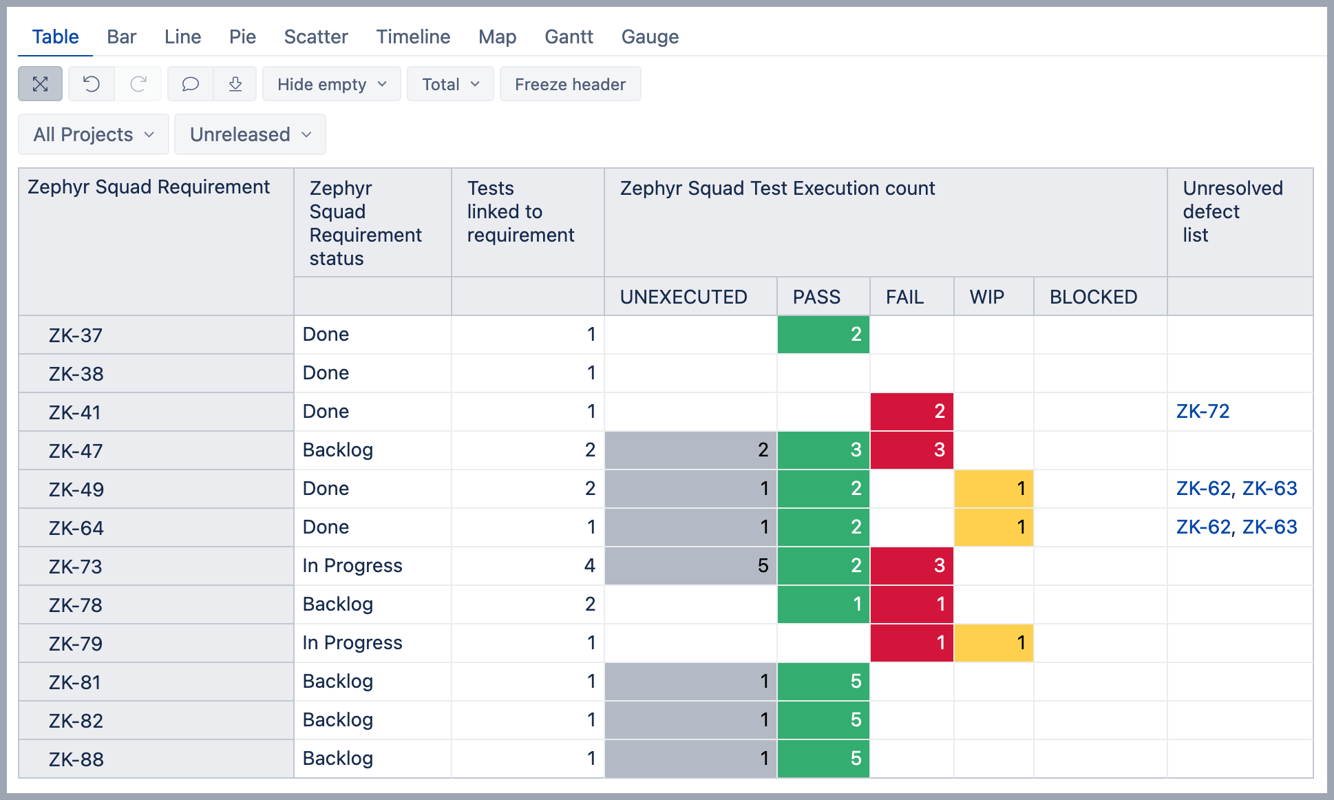 "definition": {"columns":{"dimensions":[{"name":"Measures","selected_set":["[Measures].[Zephyr Squad Requirement status]","[Measures].[Tests linked to requirement]","[Measures].[Zephyr Squad Test Execution count]","[Measures].[Unresolved defect list]"],"members":[{"depth":0,"full_name":"[Measures].[Tests linked to requirement]","format_string":"#,##0","report_specific":true,"name":"Tests linked to requirement","calculated":true,"id":"[Measures].[Tests linked to requirement]"},{"depth":0,"name":"Zephyr Squad Test Execution count","full_name":"[Measures].[Zephyr Squad Test Execution count]","format_string":"#,##0","annotations":{"group":"Zephyr Squad","predefined":"true"},"calculated":true,"drilled_into_dimension":"Zephyr Squad Test Status"},{"depth":0,"full_name":"[Measures].[Unresolved defect list]","format_string":"MarkdownFormatter","report_specific":true,"name":"Unresolved defect list","calculated":true}]},{"name":"Zephyr Squad Test Status","selected_set":["[Zephyr Squad Test Status].[Status].Members"],"members":[],"bookmarked_members":[]}]},"rows":{"dimensions":[{"name":"Zephyr Squad Requirement","selected_set":["[Zephyr Squad Requirement].[Requirement].Members"],"members":[],"bookmarked_members":[]}],"nonempty_crossjoin":true},"pages":{"dimensions":[{"name":"Project","selected_set":["[Project].[All Projects]"],"members":[{"depth":0,"name":"All Projects","full_name":"[Project].[All Projects]","drillable":true,"type":"all"}],"bookmarked_members":[],"current_page_members":["[Project].[All Projects]"]},{"name":"Fix Version","selected_set":["[Fix Version].DefaultMember"],"members":[{"depth":0,"name":"All Fix Versions","full_name":"[Fix Version].[All Fix Versions]","drillable":true,"type":"all","expanded":true,"drilled_into":false},{"depth":1,"name":"ZB Kanban","full_name":"[Fix Version].[ZB Kanban]","drillable":true,"key":"ZK","expanded":true,"drilled_into":false,"parent_full_name":"[Fix Version].[All Fix Versions]"},{"depth":2,"name":"Unreleased","full_name":"[Fix Version].[ZB Kanban].[Unreleased]","drillable":true,"parent_full_name":"[Fix Version].[ZB Kanban]"}],"bookmarked_members":[],"current_page_members":["[Fix Version].[ZB Kanban].[Unreleased]"]}]},"options":{},"view":{"current":"table","maximized":false,"table":{"show_key":["Zephyr Squad Requirement"],"row_dimension_headers":{"Zephyr Squad Requirement":true},"cell_formatting":{"[Zephyr Squad Test Status].[UNEXECUTED]":{"type":"range","rules":[{"min":"1","background_color":"#B3BAC5"}]},"[Zephyr Squad Test Status].[PASS]":{"type":"range","rules":[{"background_color":"#34AD70","min":"1"}]},"[Zephyr Squad Test Status].[FAIL]":{"type":"range","rules":[{"min":"1","background_color":"#D4153B"}]},"[Zephyr Squad Test Status].[WIP]":{"type":"range","rules":[{"min":"1","background_color":"#FFD04D"}]},"[Zephyr Squad Test Status].[BLOCKED]":{"type":"range","rules":[{"min":"1","background_color":"#376BB7"}]}}}},"calculated_members":[]}