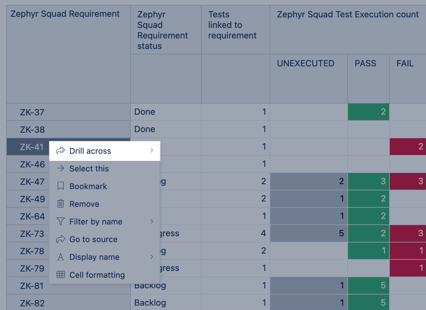 - Zephyr Squad Test Execution count is Zephyr-specific measure and shows a count of all executions related to each requirement. Click on the measure header and choose option Drill into → Zephyr Squad → Zephyr Squad Tests Status to see the execution count split by results. Here are more details on how to drill into one measure by some dimension values.