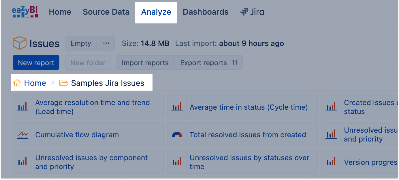 eazyBI will create a sample folder Samples Jira Issues if the Import sample reports option is enabled for the account (please see how to import Data from Jira for more details).