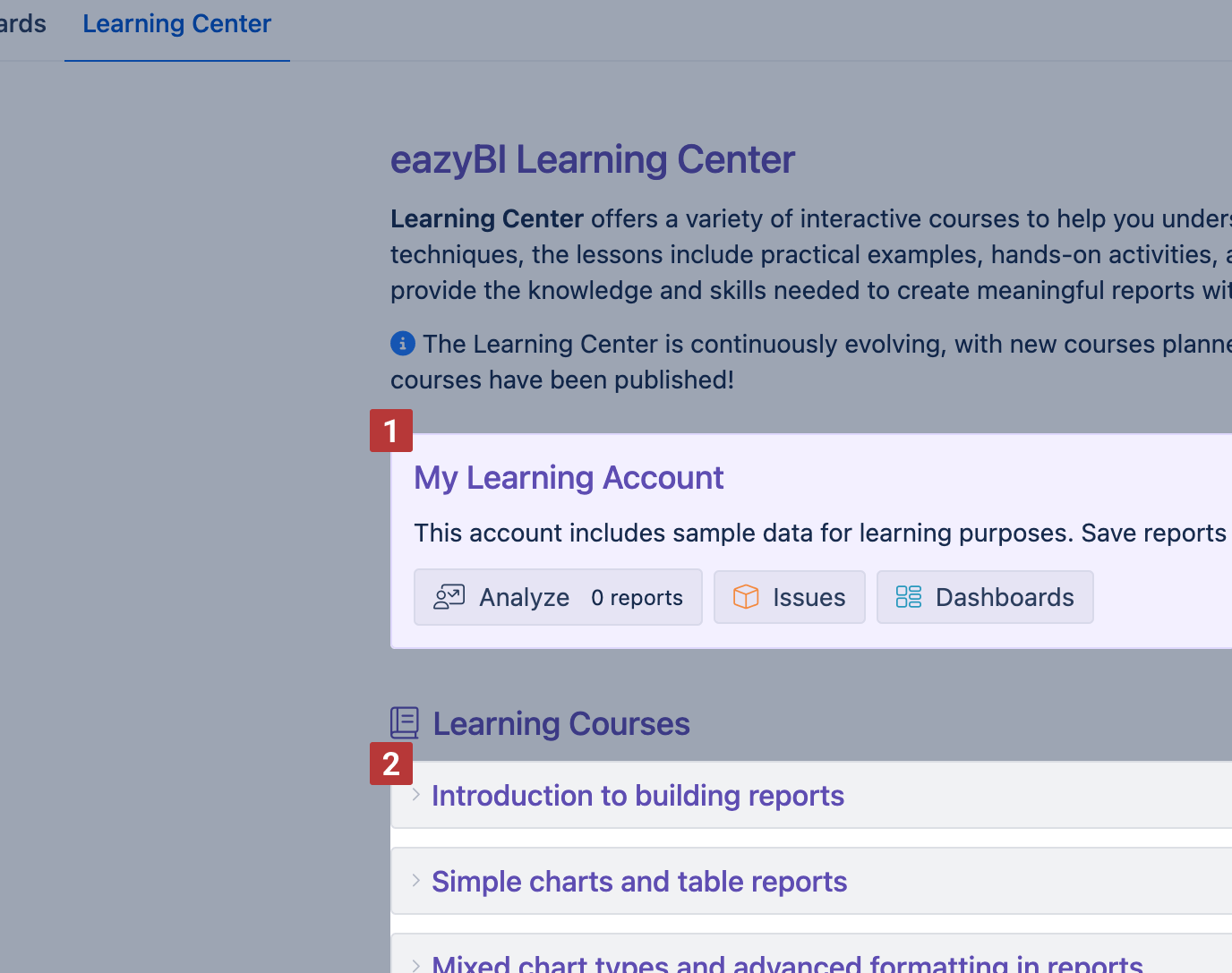 The Learning Center provides interactive courses to help you explore and work with eazyBI at your own pace. It offers structured lessons on various topics, featuring practical examples and hands-on activities to deepen your understanding. All courses are open to everyone, free of charge.