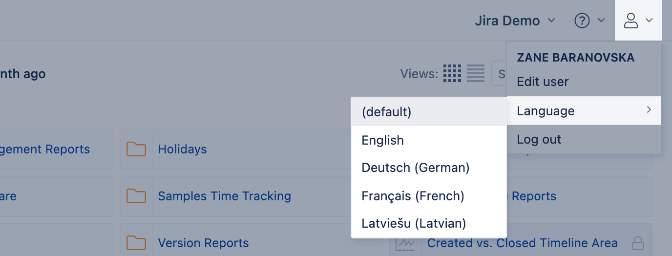 Currently, a limited list of languages is supported on eazyBI for the Jira Cloud app and eazybi.com cloud subscription accounts: default languages and English (en), German (de), French (fr), Latvian (lv) and available translations for Spanish (es), Portuguese (pt-BR), and Russian (ru) languages,.