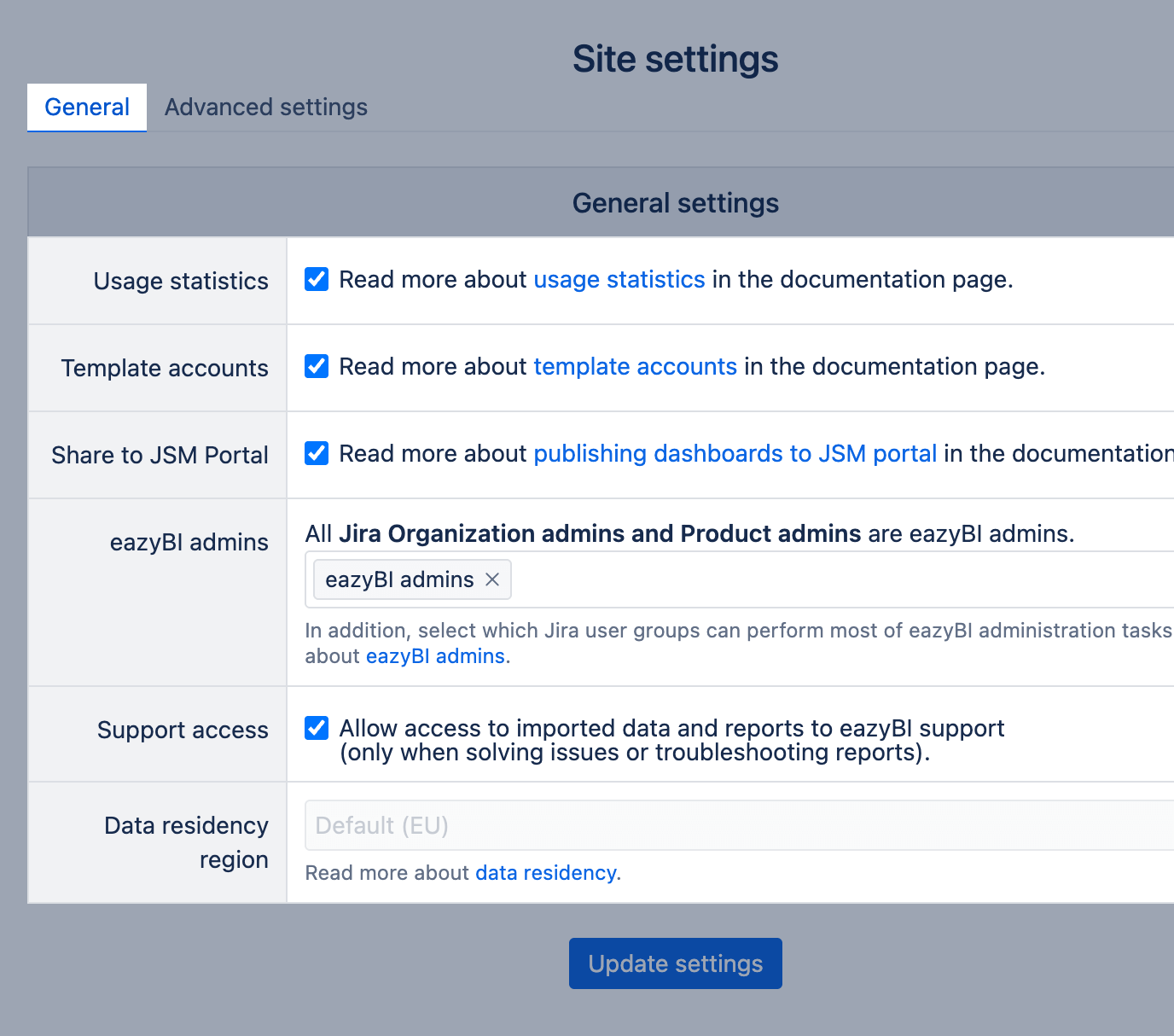 - access and change eazyBI advanced settings