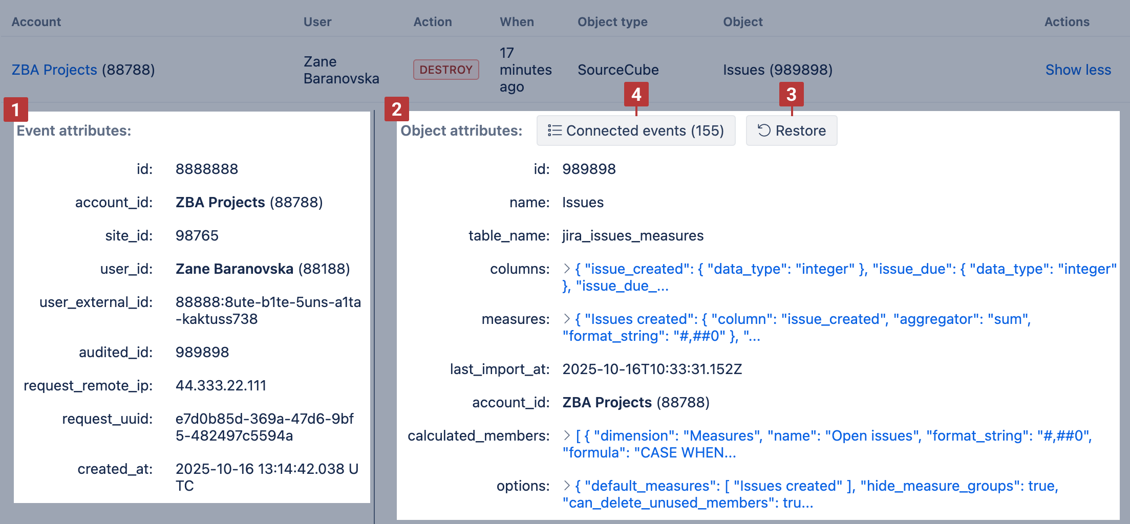 - for Destroy action, will show the full details of the object before deletion. You can restore deleted objects by clicking the Restore [3] button. This will restore the object to its original state before deletion, with the same ID it had before (new objects are not created). Some objects may have connected events that are deleted and restored together with the object; in such cases, a button Connected events is available [4]. You can also restore individual objects from the connected event list.