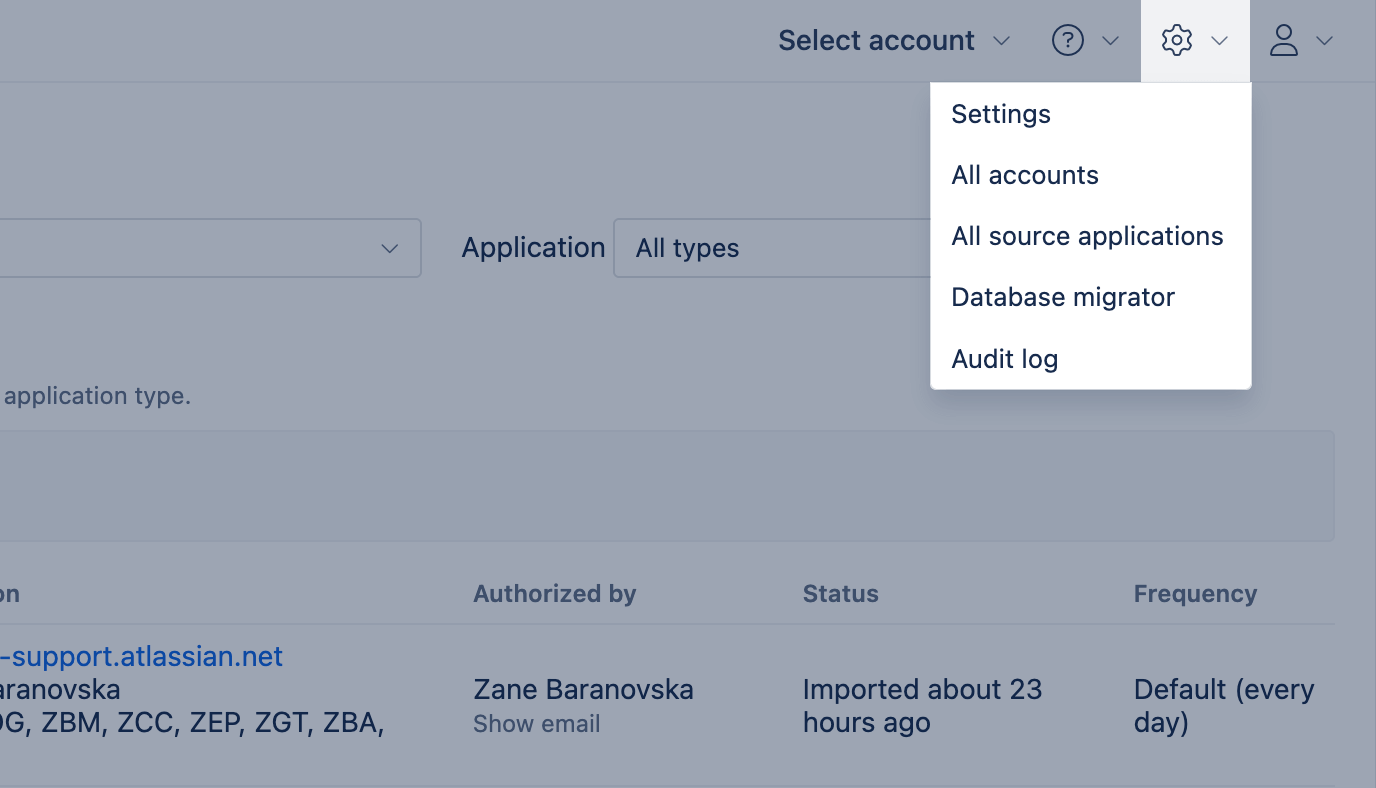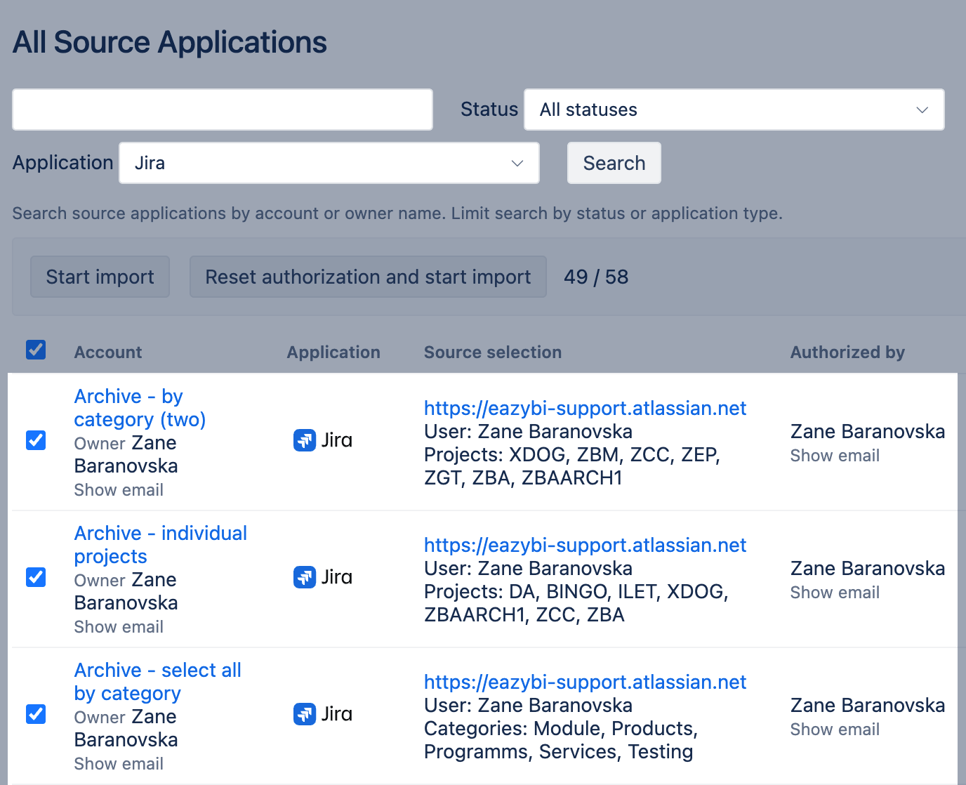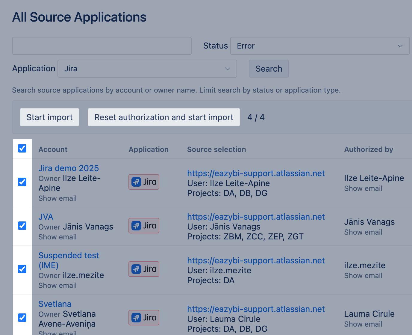 - Reset authorization and start import for selected source applications. This is convenient when a new eazyBI account user should authorize imports now.