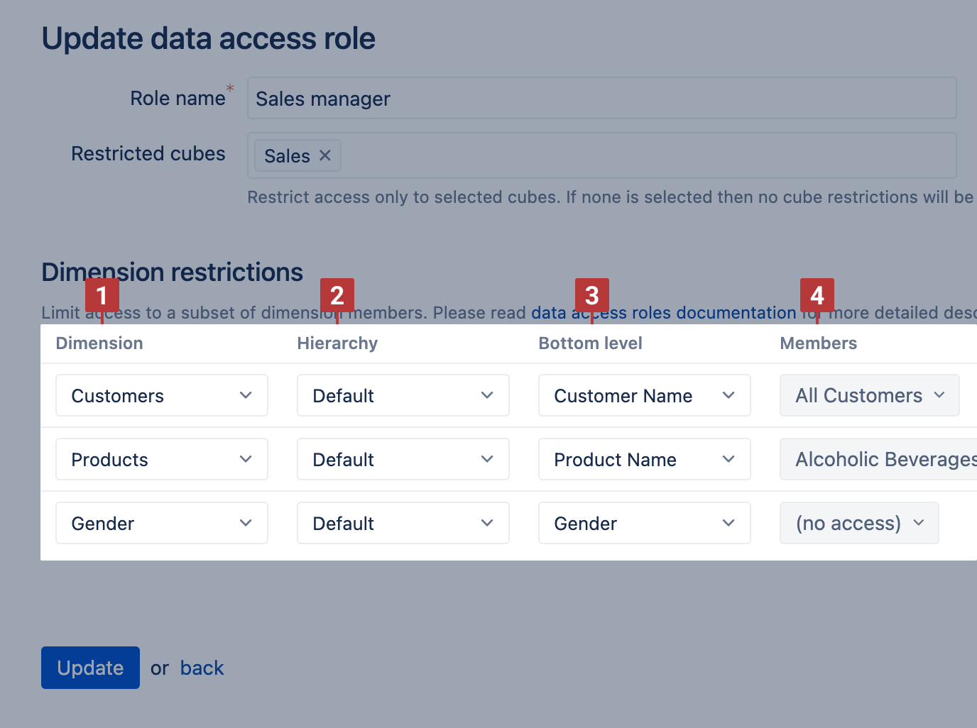 - limit access only to selected members in some dimensions (requires advanced configuration);