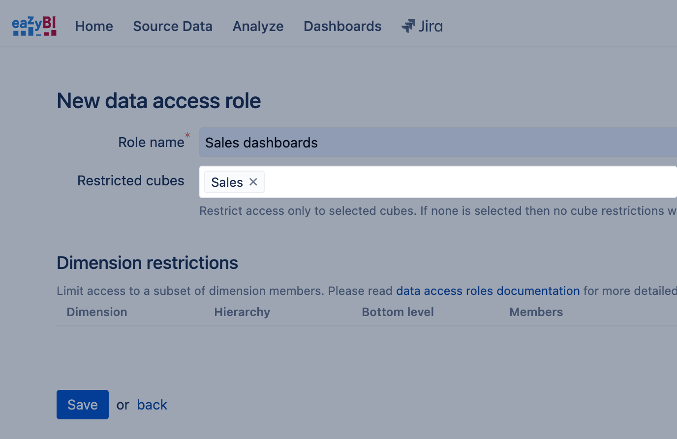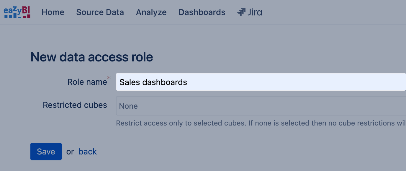 If you would like to use a data access role only to limit access to report folders and dashboards, then specify only Role name (and leave restricted cubes empty). You will then use this data access role when editing a report folder or a dashboard.
