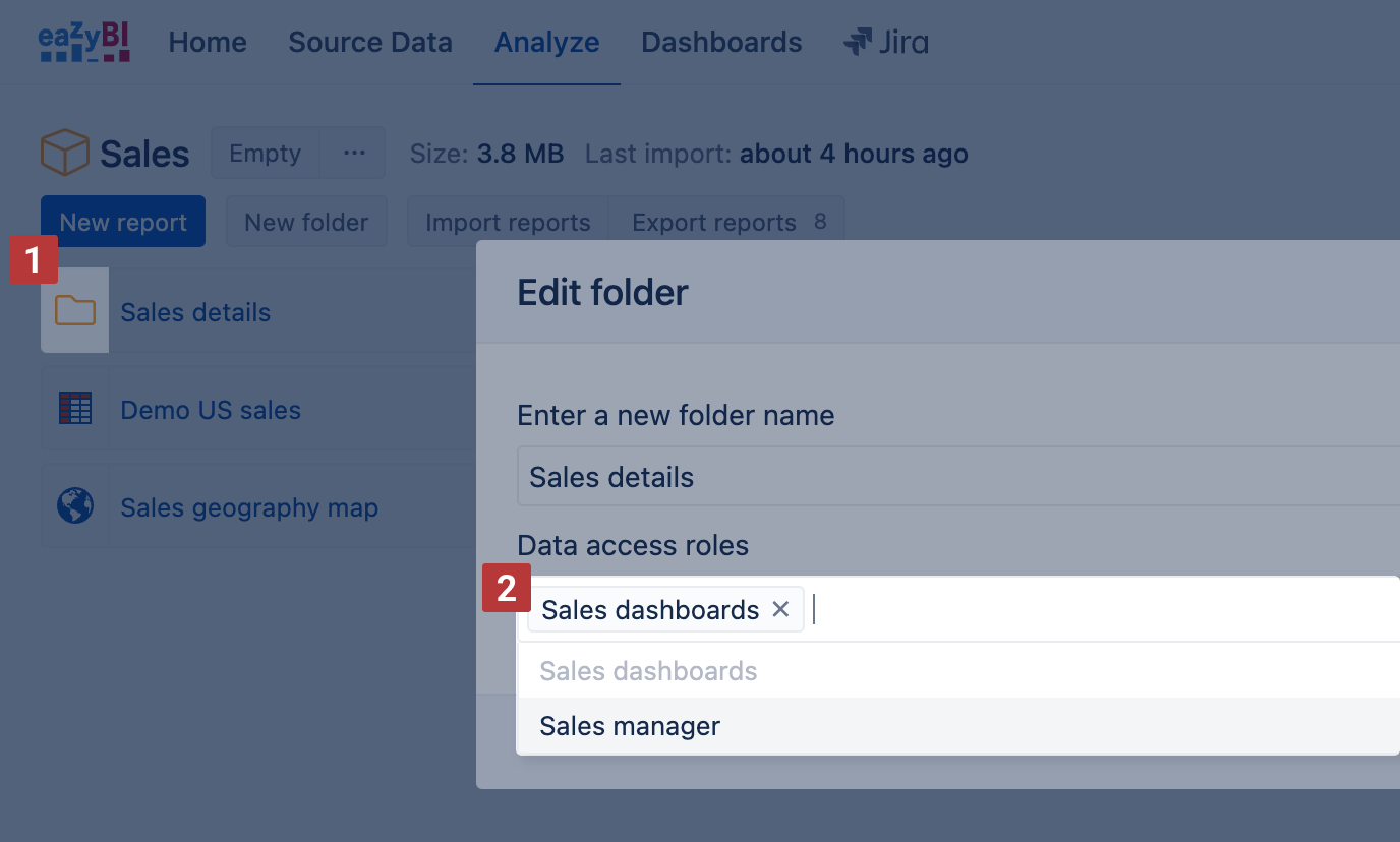 In the Analyze tab, select the Edit folder [1] action and select one or multiple data access roles [2] for the folder. Only users with at least one of these data access roles can access this report folder.