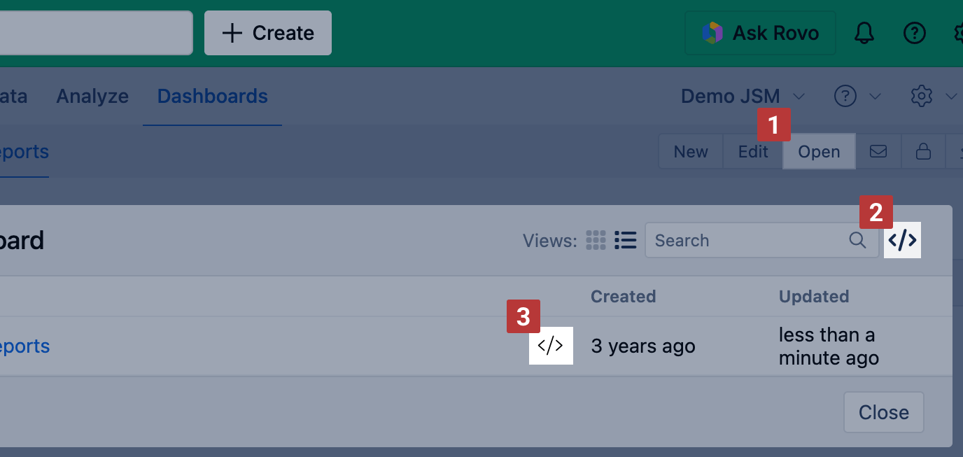 To find all dashboards published with a public access token, open the Dashboard tab, click the Open dashboard [1], and use the Has embed token icon (</>) [2] to display them in the dashboard list [3].