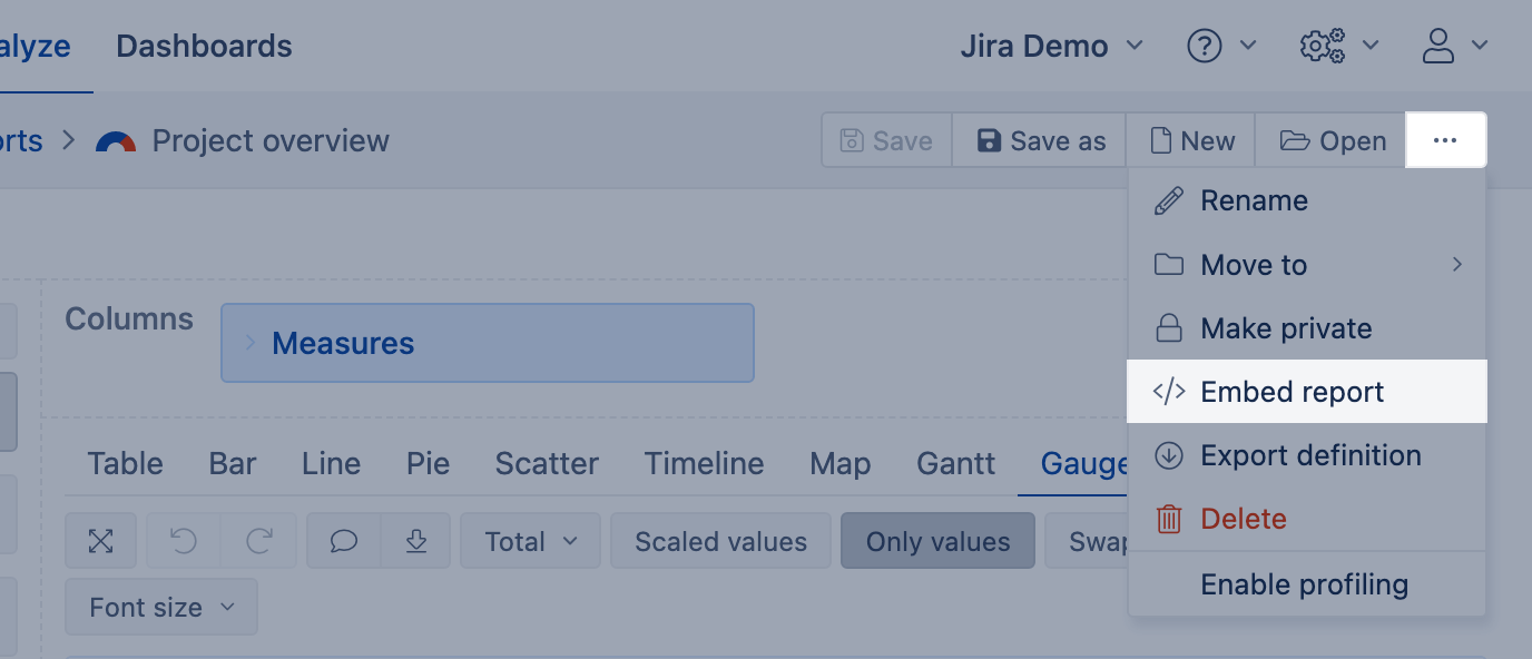 - disable all or enable only some actions that can or cannot be performed by end users in the embedded report or dashboard (expand/drill into, drill through issues, drill across issues, change page selection)