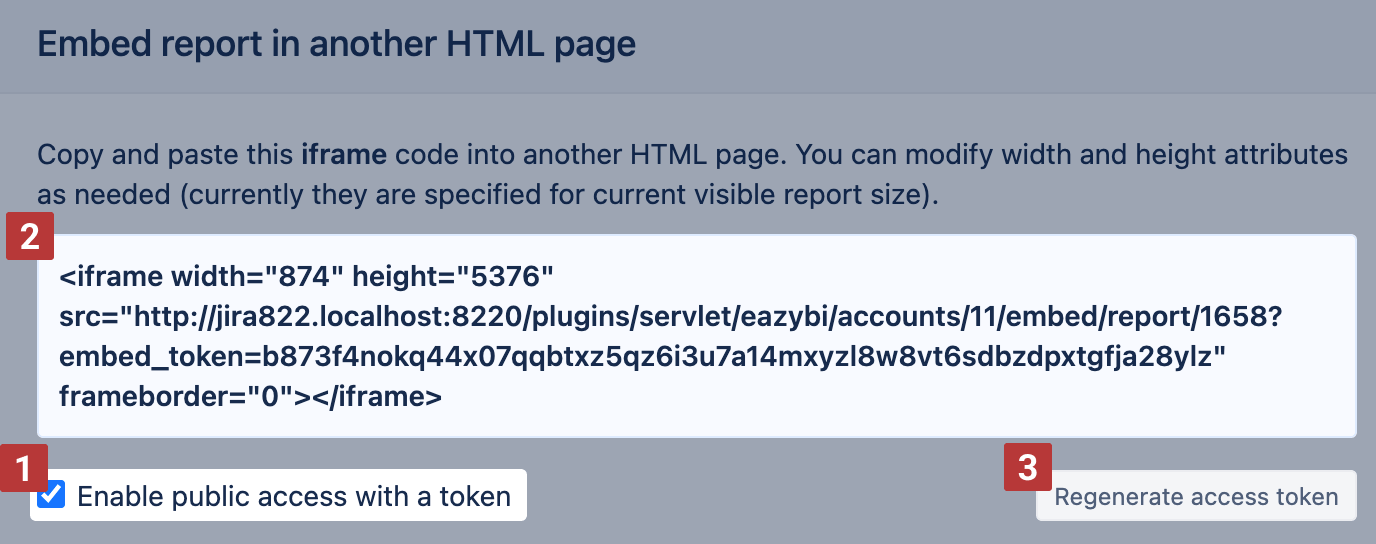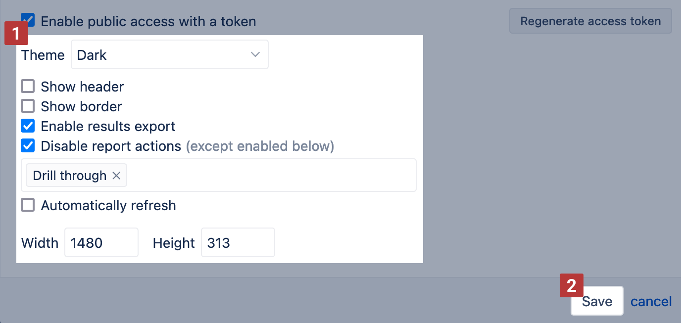 Then select Enable public access with a token [1]. An additional parameter embed_token is added to the iframe URL [2]. This token is unique for this report (or dashboard) and will be used to authenticate that anonymous users can see report results for this specific report. Note the report data won't be visible to users without this public access token.