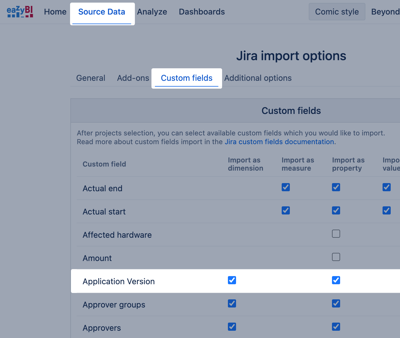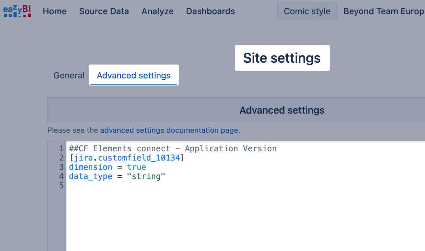 - In eazyBI, navigate to advanced settings and add definition for fields with data type and dimension parameter (use custom field ID instead of XXXXX)