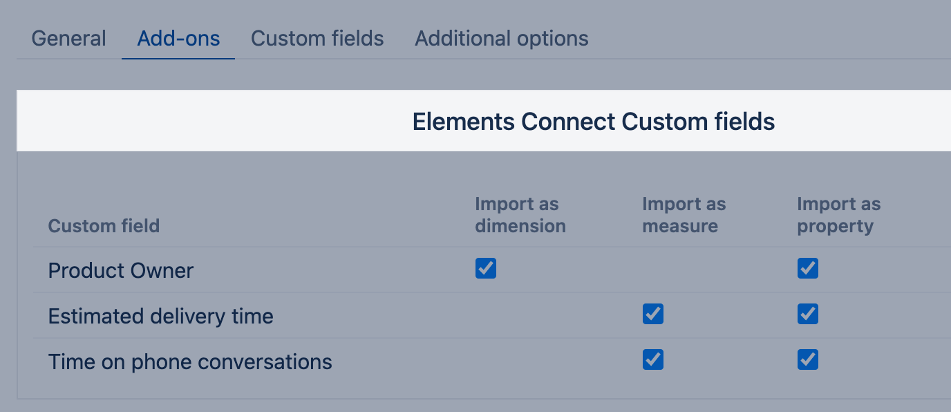 Once you have installed the app, Elements Connect custom fields are available in the eazyBI Jira import options Add-ons tab.