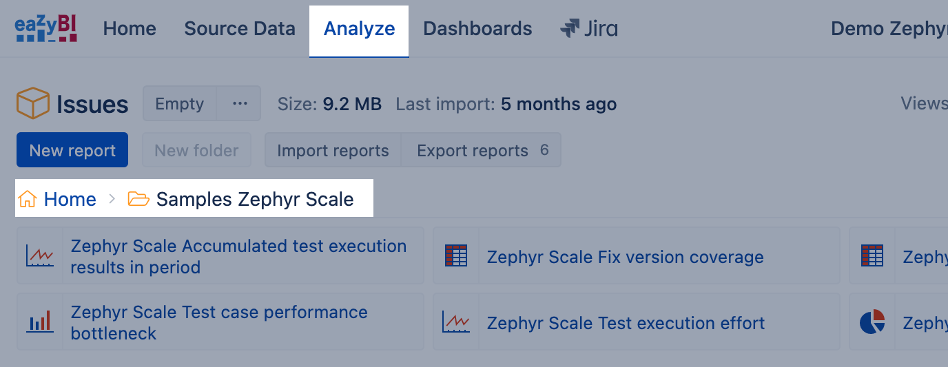 If you selected the Import sample reports option, then additional sample reports are created in the Samples Zephyr Scale folder. Please try these reports to see which measures would be useful for your specific needs. If you would like to customize some reports, then save them and change the name (as the default sample reports are overwritten during each Jira import).