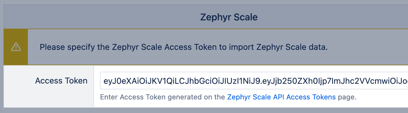 You should authorize data import for Zephyr Scale on Cloud. Please specify the Zephyr Scale Access Token to import Zephyr Scale data.